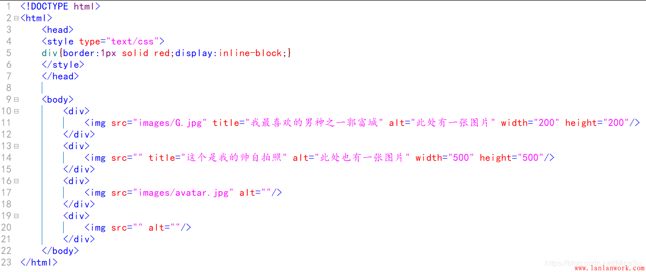 title和alt 的區(qū)別別,體現(xiàn)在 第 11 行和第 14 行,想必大家就能看出來(lái)了吧