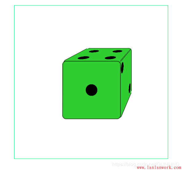<!DOCTYPE html> <html lang="en"> <head> <meta charset="UTF-8"> <meta name="viewport" content="width=device-width, initial-scale=1.0"> <title>Document</title> <style> *{margin: 0;padding: 0;} ul{list-style: none;} a{text-decoration: none;} img{display: block;} .box1{width: 150px;height: 150px;display: flex;border: 1px black solid;margin: 20px auto;border-radius: 10px;justify-content: center;align-items: center;} .box1 div{width: 30px;height: 30px;border-radius:50%;background: black;} .box2{width: 150px;height: 150px;display: flex;border: 1px black solid;margin: 20px auto;border-radius: 10px;align-items: center;justify-content: space-between;} .box2 div{width: 30px;height: 30px;border-radius:50%;background: black;margin: 10px;} .box2 div:nth-of-type(1){align-self: flex-start;} .box2 div:nth-of-type(2){align-self: flex-end;} .box3{width: 150px;height: 150px;display: flex;border: 1px black solid;margin: 20px auto;border-radius: 10px;align-items: center;justify-content: space-between;} .box3 div{width: 30px;height: 30px;border-radius:50%;background: black;margin: 10px;} .box3 div:nth-of-type(1){align-self: flex-start;} .box3 div:nth-of-type(3){align-self: flex-end;} .box4{width: 150px;height: 150px;border: 1px black solid;margin: 20px auto;border-radius: 10px;display: flex;flex-direction: column;} .box4 div{height: 50%;display: flex;flex-direction: row;justify-content: space-around;align-items: center;} .box4 div li{display: block; width: 30px;height: 30px;border-radius:50%;background: black;} .box5{width: 150px;height: 150px;border: 1px black solid;margin: 20px auto;border-radius: 10px;display: flex;flex-direction: column;} .box5 div{height: 50%;display: flex;flex-direction: row;justify-content: space-around;align-items: center;} .box5 div li{display: block; width: 30px;height: 30px;border-radius:50%;background: black;} .box6{width: 150px;height: 150px;border: 1px black solid;margin: 20px auto;border-radius: 10px;display: flex;flex-direction: column;} .box6 div{height: 50%;display: flex;flex-direction: row;justify-content: space-around;align-items: center;} .box6 div li{display: block; width: 30px;height: 30px;border-radius:50%;background: black;} #box{width: 400px;height: 400px;margin: 20px auto;border: 1px springgreen solid; perspective: 500px;perspective-origin: right top;} #box .main{position: relative;width: 150px;height: 150px;margin: 125px; transform-style: preserve-3d;transition: 4s;transform-origin: center center -50px;} #box .main .box1{position: absolute;background:limegreen;left: 0;top: 0; width: 150px;height: 150px;} #box .main .box2{position: absolute;background:limegreen;left: 0;top: 0; width: 150px;height: 150px;left: 150px;transform-origin:left; transform:rotateY(90deg);} #box .main .box3{position: absolute;background:limegreen;left: 0;top: 0; width: 150px;height: 150px;left: -150px;transform-origin:right; transform:rotateY(-90deg);} #box .main .box4{position: absolute;background:limegreen;left: 0;top: 0; width: 150px;height: 150px;top: -150px;transform-origin:bottom; transform:rotateX(90deg);} #box .main .box5{position: absolute;background:limegreen;left: 0;top: 0; width: 150px;height: 150px;top: 150px;transform-origin:top; transform:rotateX(-90deg);} #box .main .box6{position: absolute;background:limegreen;left: 0;top: 0; width: 150px;height: 150px;transform:translateZ(-150px) rotateY(180deg);} #box:hover .main{transform:rotateY(360deg);} </style> </head> <body> <div id="box"> <div class="main"> <div class="box1"> <div></div> </div> <div class="box2"> <div></div> <div></div> </div> <div class="box3"> <div></div> <div></div> <div></div> </div> <div class="box4"> <div> <li></li> <li></li> </div> <div> <li></li> <li></li> </div> </div> <div class="box5"> <div> <li></li> <li></li> </div> <div> <li></li> </div> <div> <li></li> <li></li> </div> </div> <div class="box6"> <div> <li></li> <li></li> </div> <div> <li></li> <li></li> </div> <div> <li></li> <li></li> </div> </div> </div> </div> </body> </html>實(shí)際效果:
