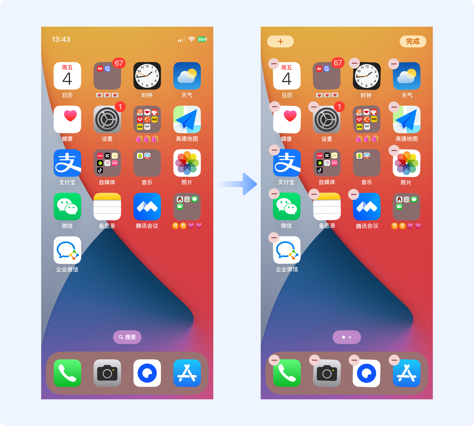 移動(dòng)端產(chǎn)品中有很多這樣的案例,如iOS系統(tǒng)中,長(zhǎng)按刪除某個(gè)APP時(shí),所有桌面圖標(biāo)會(huì)抖動(dòng)、且左上角都有一個(gè)相同的刪除圖標(biāo),通過一致性的動(dòng)作告知用戶圖標(biāo)的可操作狀態(tài),非常直觀。