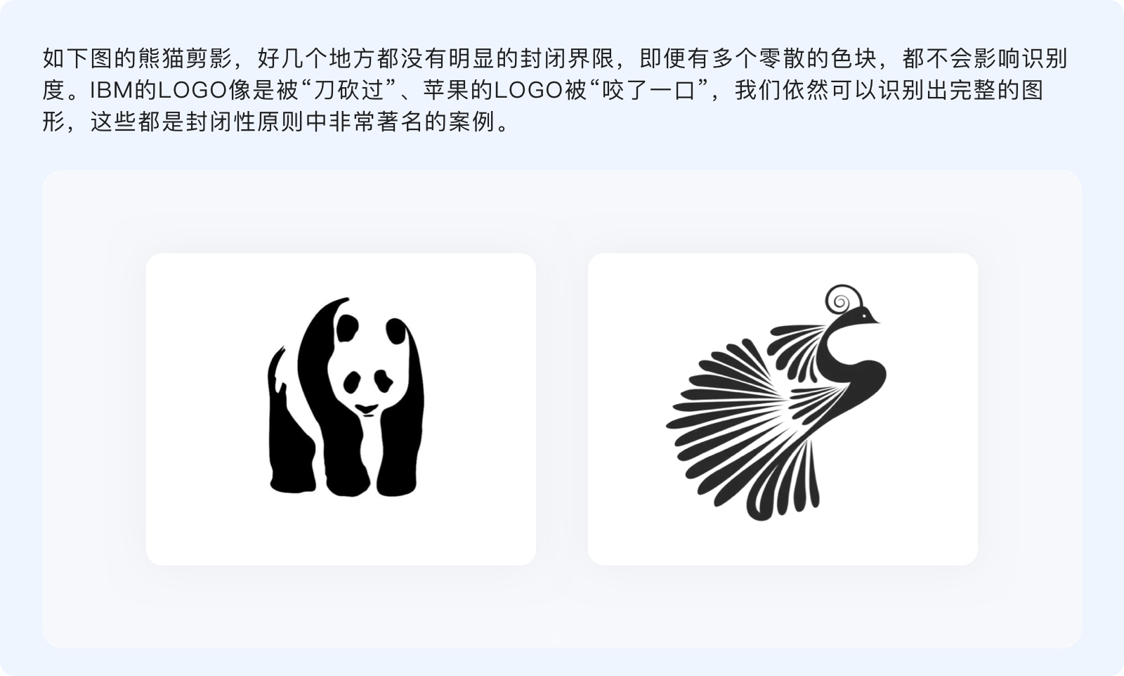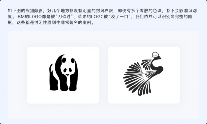 封閉性原則指出,人們的視覺系統(tǒng)傾向于將不完整的局部當(dāng)做一個(gè)整體來感知。看起來與連續(xù)性有諸多相似,不過連續(xù)性是通過物體的形狀和運(yùn)動(dòng)方向、按照視覺慣性來制定閉合規(guī)律,而封閉性則并無特定規(guī)律,只要把握好不完整物體的尺度、使各元素之間相互輔助,就能讓其與我們認(rèn)知模型中的原型匹配。
