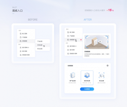 在新版優(yōu)化中圖形化的表達(dá)了圖紙類型的差異,即便增加了流程步驟數(shù),最終用戶點(diǎn)擊圖紙的UV提升了15%,此案例可以說明,更精準(zhǔn)有效的對(duì)象表達(dá)能吸引更多用戶來使用此功能,對(duì)業(yè)務(wù)產(chǎn)生直接效果。