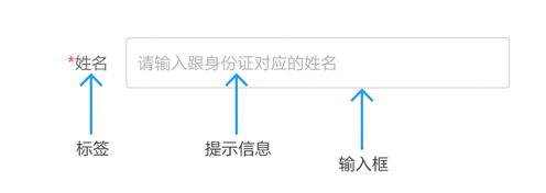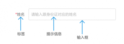 一個(gè)輸入框,通常有標(biāo)簽名稱label、提示信息placeholder(輸入信息后提示文字消失)、初始值value(需手動(dòng)刪除)。如果是必填表單,在適當(dāng)位置(標(biāo)簽的前后,輸入框后)加上紅色*號(或其他符號)