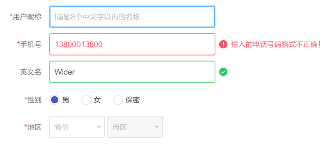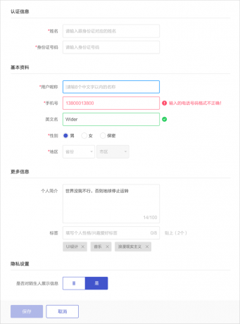 當(dāng)輸入有誤時(shí),盡量避免彈出框提示,可以直接對輸入框設(shè)計(jì)不同的狀態(tài)顯示默認(rèn)狀態(tài)、選中狀態(tài)、錯(cuò)誤狀態(tài)、成功狀態(tài)。
