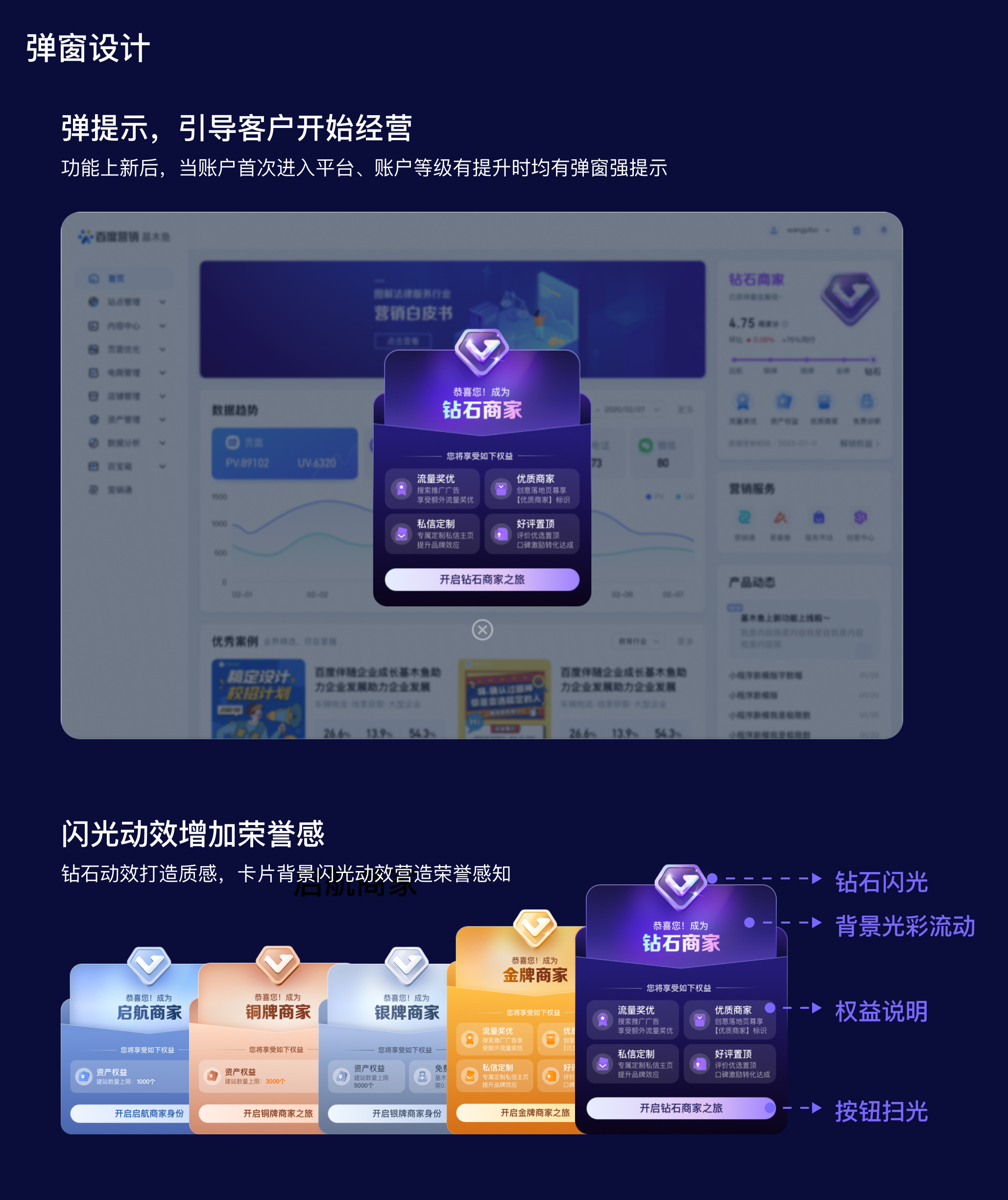彈窗:作為常見的通知容器,常用于向用戶提供重要的通知、更新、提醒或行動(dòng)建議。在此項(xiàng)目中,為了增強(qiáng)商家的感知,我們選擇2個(gè)場(chǎng)景以彈窗的形式給予商家強(qiáng)提示,一是在功能上線后以彈窗的形式顯示對(duì)應(yīng)等級(jí)的信息,以吸引商家的注意力并傳達(dá)商家等級(jí)的關(guān)鍵信息,可以增加商家的感知并引導(dǎo)他們進(jìn)入商家等級(jí)開始經(jīng)營(yíng);二是當(dāng)商家的等級(jí)提升時(shí)使用彈窗通知,激勵(lì)商家持續(xù)經(jīng)營(yíng)。
