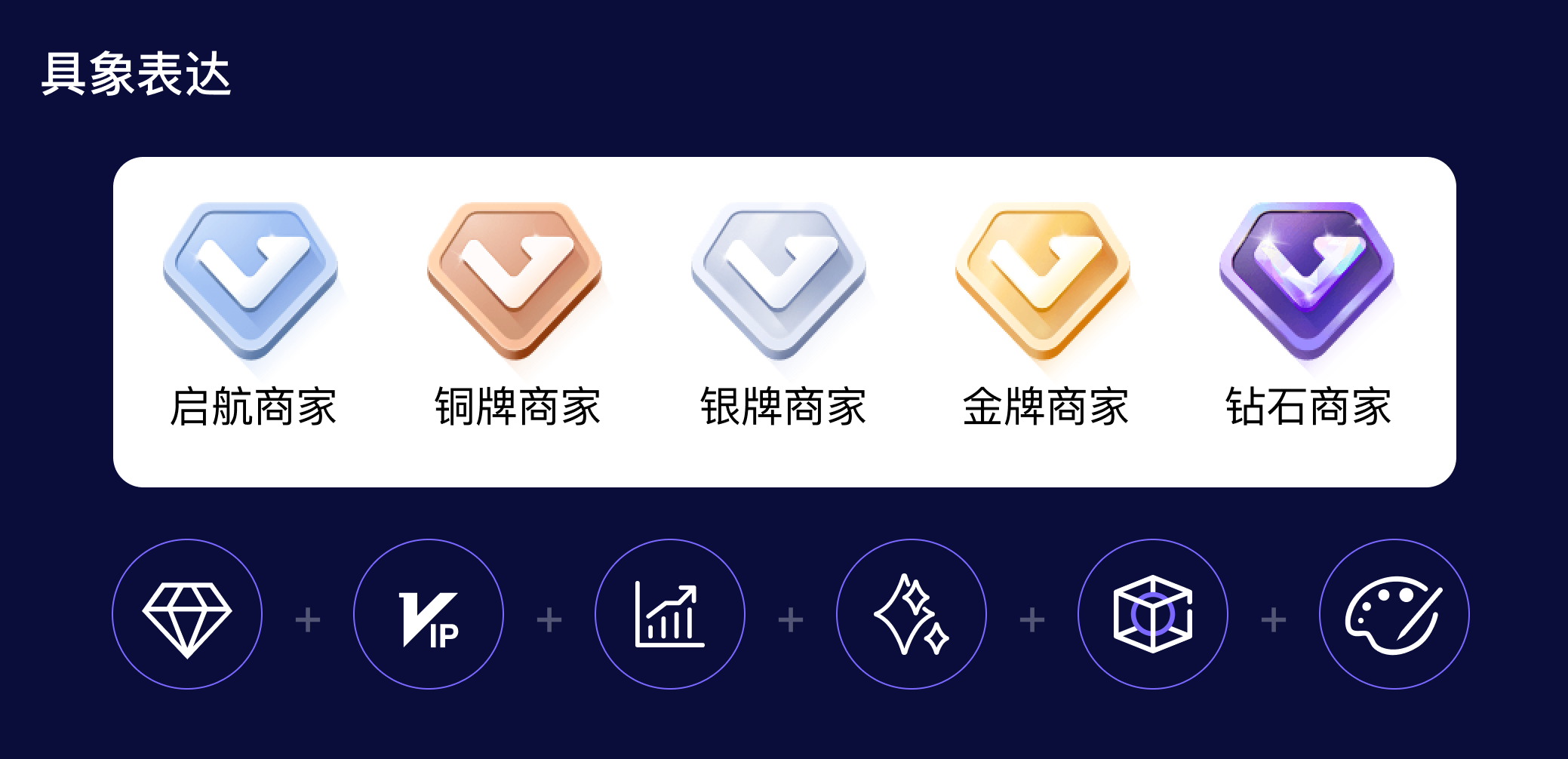具象表達(dá):有了設(shè)計(jì)關(guān)鍵詞,通過(guò)頭腦風(fēng)暴獲取了一些可以體現(xiàn)這些關(guān)鍵詞的具體事物:鉆石、VIP、箭頭、Blingbling、3D、金銀銅等,希望通過(guò)具象的事物表達(dá)抽象的情緒詞,于是我們從「鉆石」開始入手,把鉆石和VIP、箭頭不斷結(jié)合,同時(shí)融入BlingBling,金銀銅色等具有普遍認(rèn)知的元素,用偽3D效果來(lái)增加徽標(biāo)的立體感,最終打造一種獎(jiǎng)牌的形態(tài),給客戶帶來(lái)更多榮譽(yù)感知,突出商家等級(jí)的重要性。