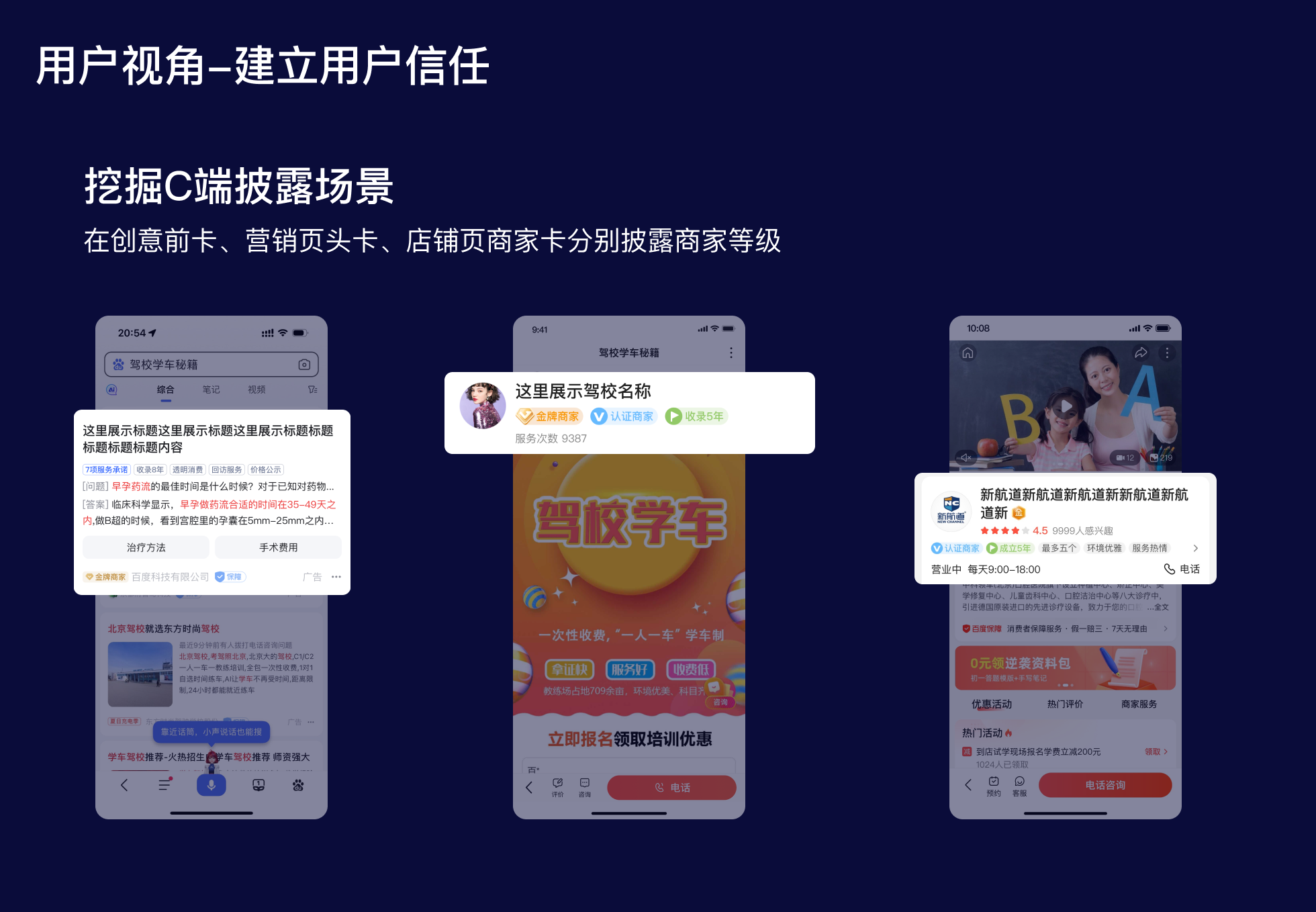 從用戶視角出發(fā),商家等級(jí)項(xiàng)目的主要目標(biāo)是建立用戶信任,所以設(shè)計(jì)師在強(qiáng)化徽標(biāo)設(shè)計(jì)的同時(shí),更需要挖掘用戶視角的披露場(chǎng)景,通過(guò)增加C端披露,幫助用戶了解該商家在百度生態(tài)內(nèi)的等級(jí)情況,以輔助用戶決策。本項(xiàng)目中在C端共新增3個(gè)場(chǎng)景進(jìn)行商家等級(jí)的披露,①搜索前卡;②營(yíng)銷頁(yè)頭卡;③店鋪?lái)?yè)首卡。在3個(gè)重點(diǎn)場(chǎng)景披露商家的等級(jí)徽標(biāo),用戶在選擇商家時(shí)可以參考商家的等級(jí),增強(qiáng)對(duì)商家的信任和認(rèn)知。