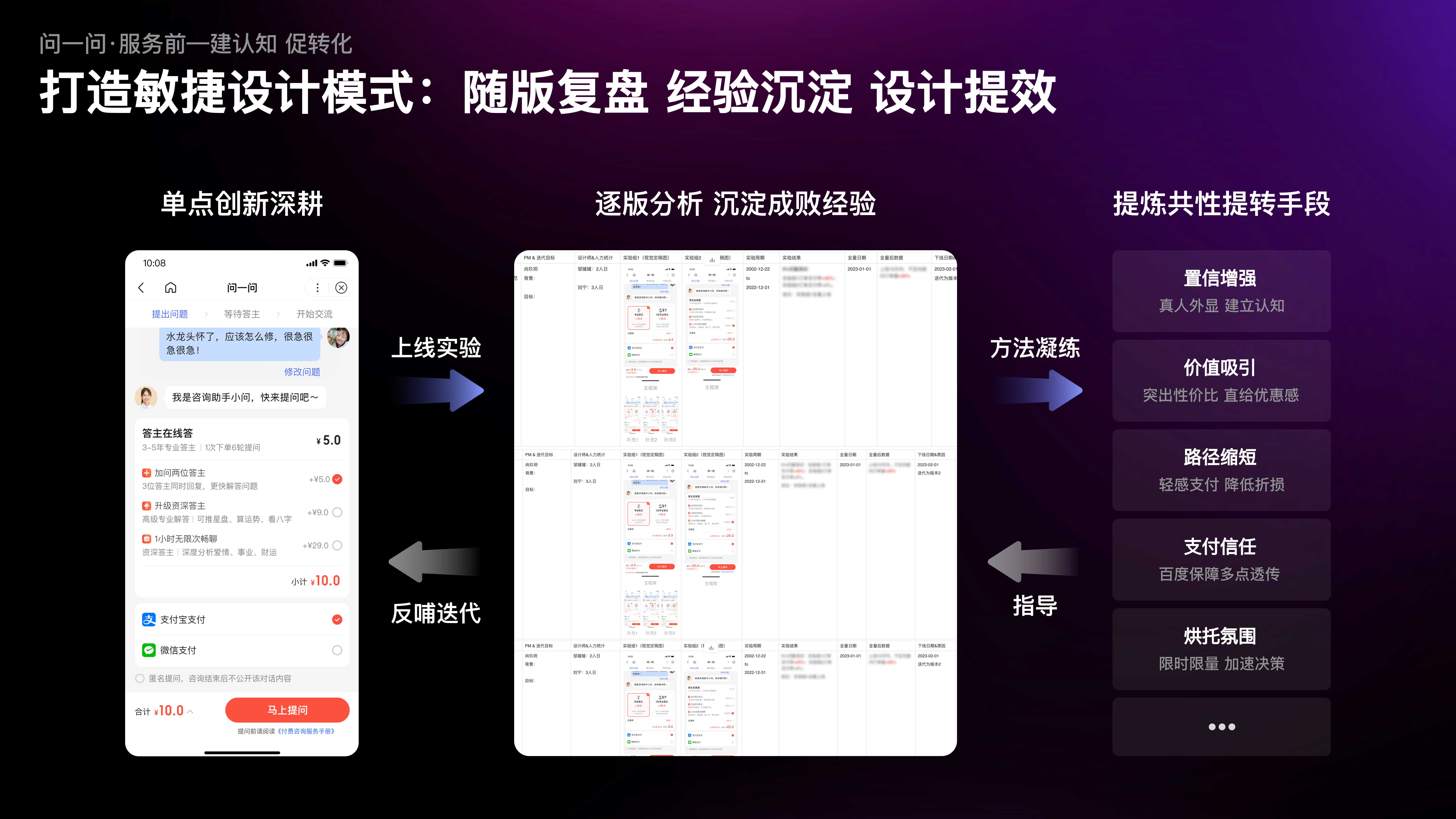 ?為了進一步提升設(shè)計效率,我們將提問頁的迭代歷史進行線上化記錄,并組織團隊定期復(fù)盤總結(jié),提煉出「真人外顯-增強置信感」「優(yōu)惠直給-突出性價比」「路徑縮短-弱化支付感」等一系列通用的提轉(zhuǎn)手段;又將這些手段復(fù)用到服務(wù)上下游環(huán)節(jié)的同類場景中,通過系統(tǒng)化提轉(zhuǎn),有效幫助業(yè)務(wù)訂單量、GMV大幅提升。