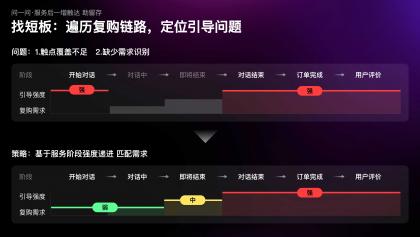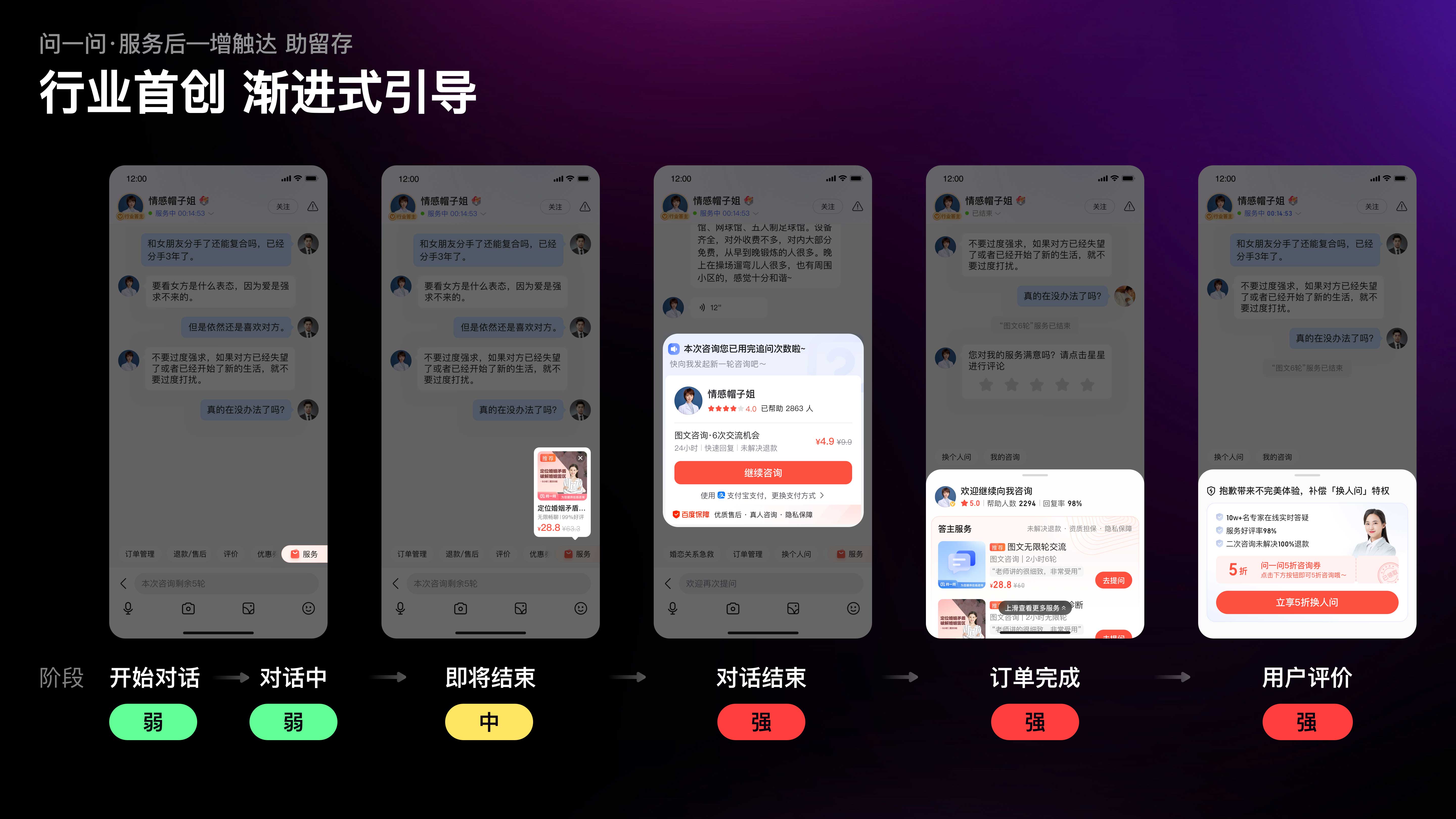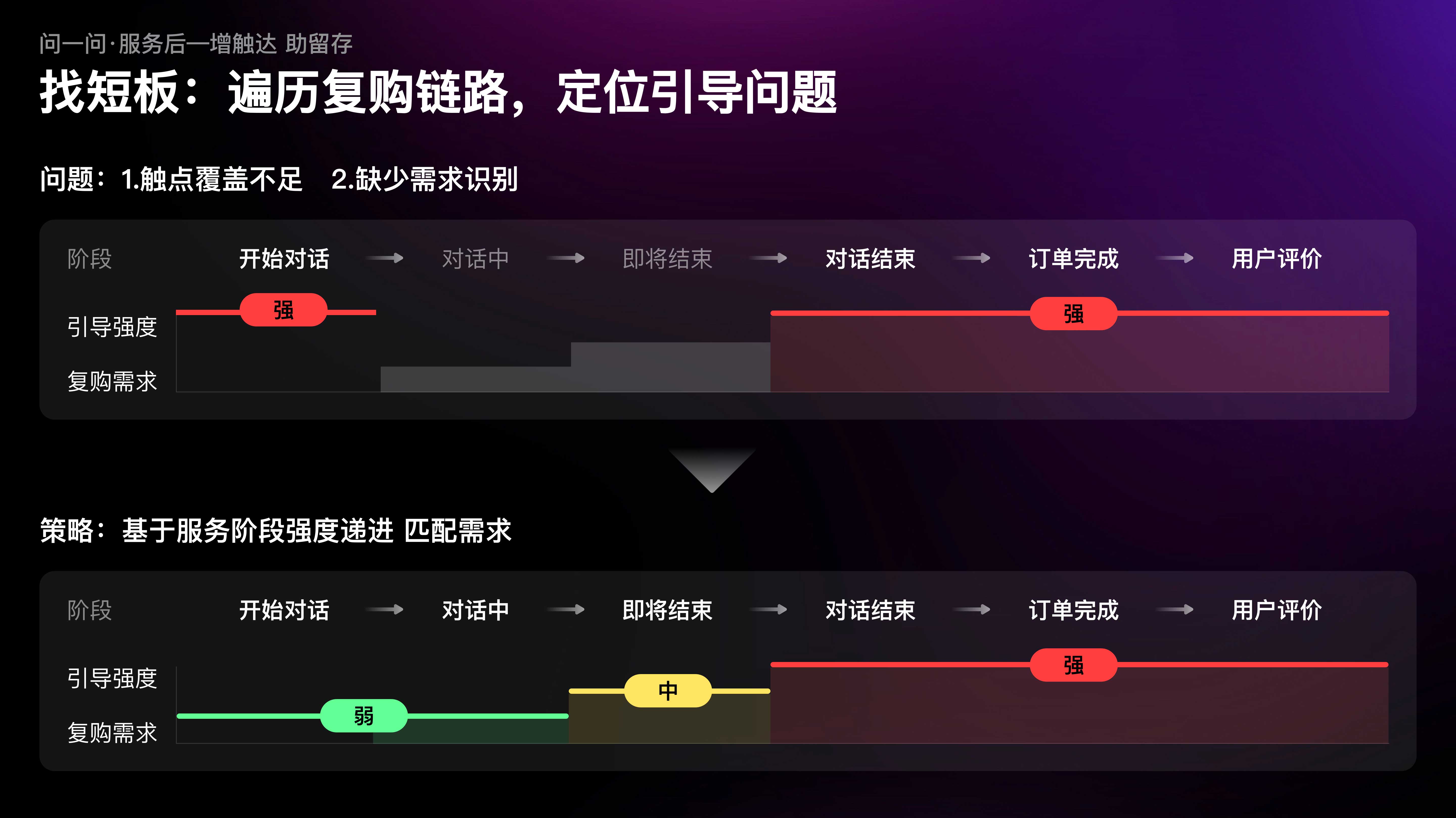 當我們以用戶視角,遍歷咨詢鏈路中的復(fù)購引導(dǎo)時,發(fā)現(xiàn)復(fù)購引導(dǎo)的觸點覆蓋不足,且缺少對特定場景下需求的識別,例如在咨詢開始時復(fù)購需求極弱,但設(shè)計引導(dǎo)極強;而在隨后的對話過程中需求漸增,但引導(dǎo)缺失。因此,我們制定了行業(yè)首創(chuàng)的漸進式引導(dǎo)策略;隨著服務(wù)推進,復(fù)購需求漸增,觸達強度也逐級遞進。