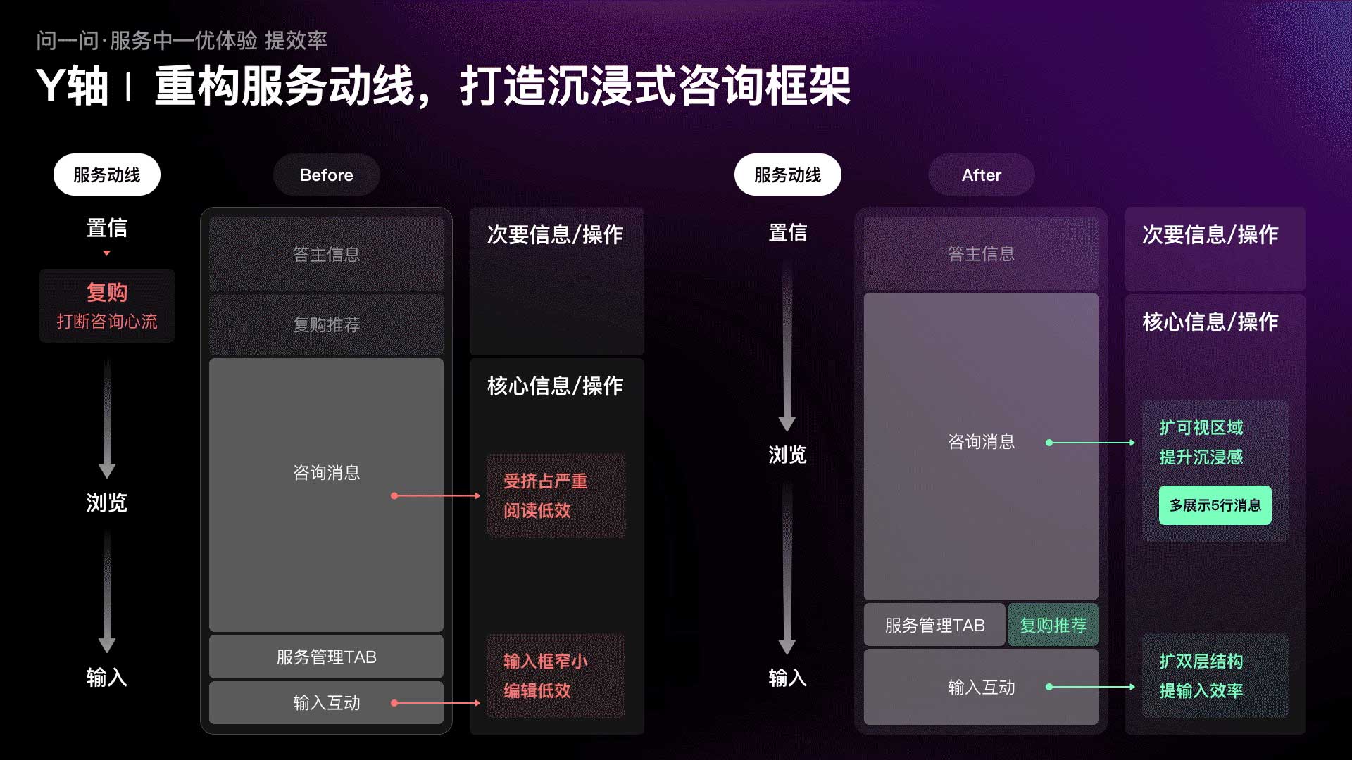?到了新的發(fā)展階段,我們的設(shè)計愿景該如何實現(xiàn)?問一問設(shè)計團隊以“服務(wù)體驗”為原點,發(fā)起了C端核心服務(wù)體驗的升級專項。借助用戶觀察、體驗遍歷等方法,沿用戶真實體驗路徑梳理服務(wù)“前-中-后”各階段的關(guān)鍵問題、挖掘優(yōu)化機會。再結(jié)合設(shè)計、體驗雙視角,建立以服務(wù)前“建認知、促轉(zhuǎn)化”、服務(wù)中“優(yōu)體驗、提效率”、服務(wù)后“增觸達、助留存”為核心指導(dǎo)原則的設(shè)計打法。通過切實滿足用戶在服務(wù)各階段需求來激發(fā)持續(xù)消費、讓服務(wù)閉環(huán)順暢運轉(zhuǎn),從而有效地賦能業(yè)務(wù)增長,達到體驗和收入的雙豐收。