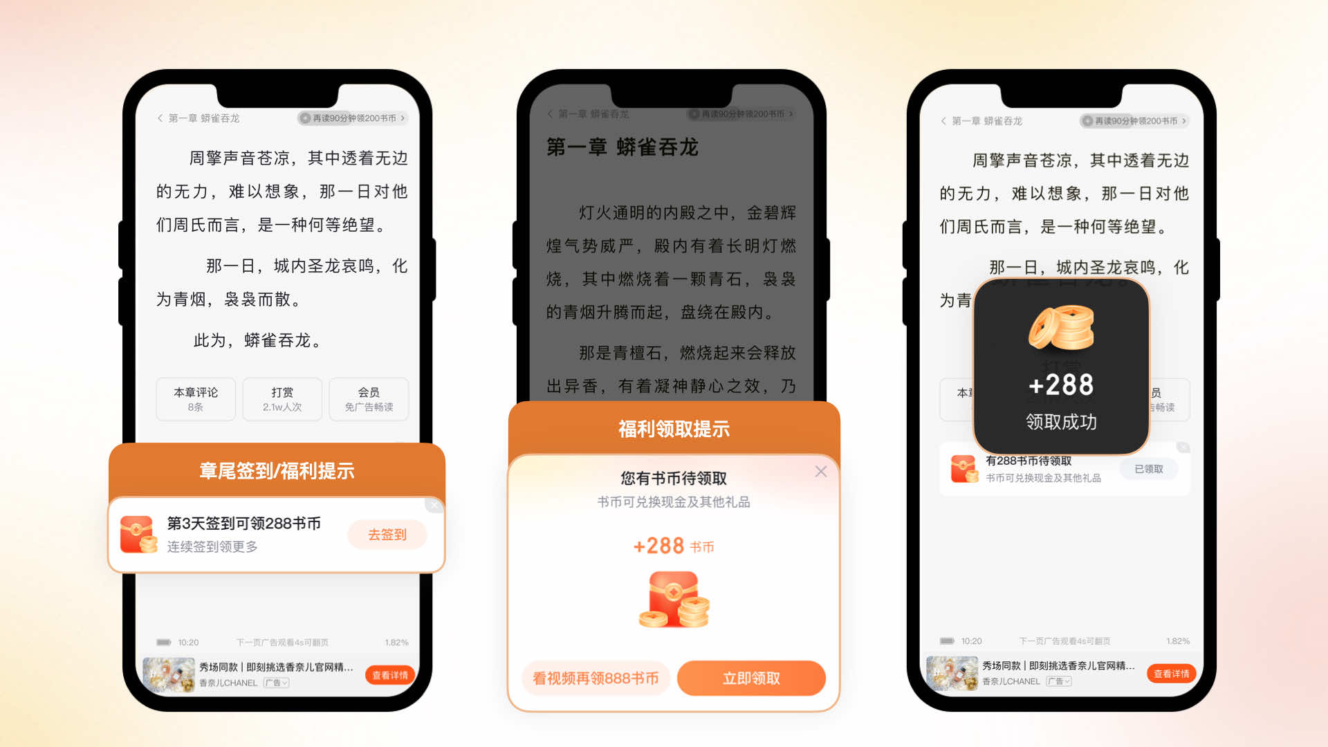 在閱讀器場景,我們增加了章尾和半層金幣領(lǐng)取提示,即時(shí)提醒用戶領(lǐng)取福利,同時(shí),強(qiáng)化領(lǐng)取成功樣式,增強(qiáng)用戶的獲得感。