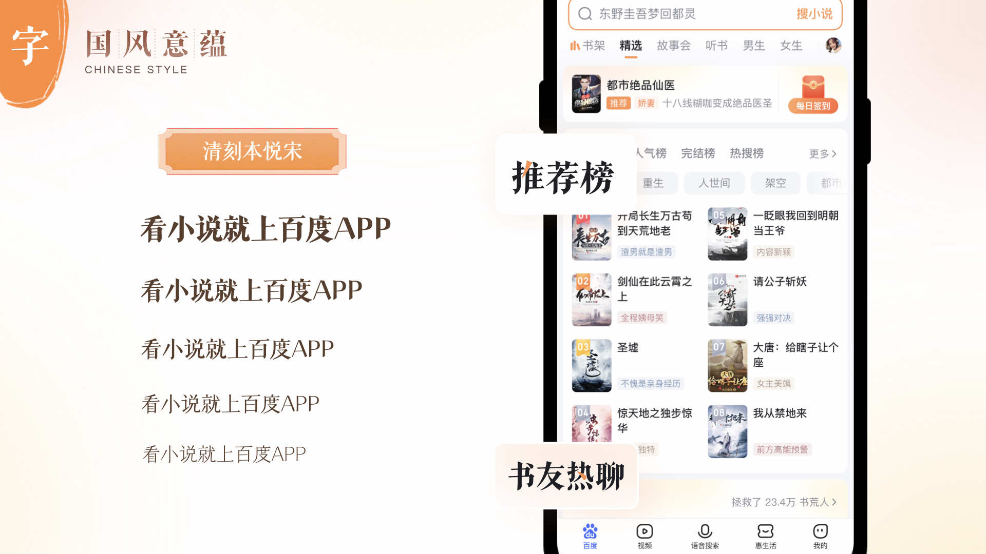 基于國風(fēng)意韻感,設(shè)計(jì)團(tuán)隊(duì)在文字的使用上,也選擇了一套襯線體字體,該字體字形瘦長,柔美清透且識別度高。在界面中,主要在標(biāo)題區(qū)應(yīng)用這套字體,將其中的一筆進(jìn)行跳色點(diǎn)綴,不僅讓用戶閱讀舒適,而且提升百度小說的品牌識別度。