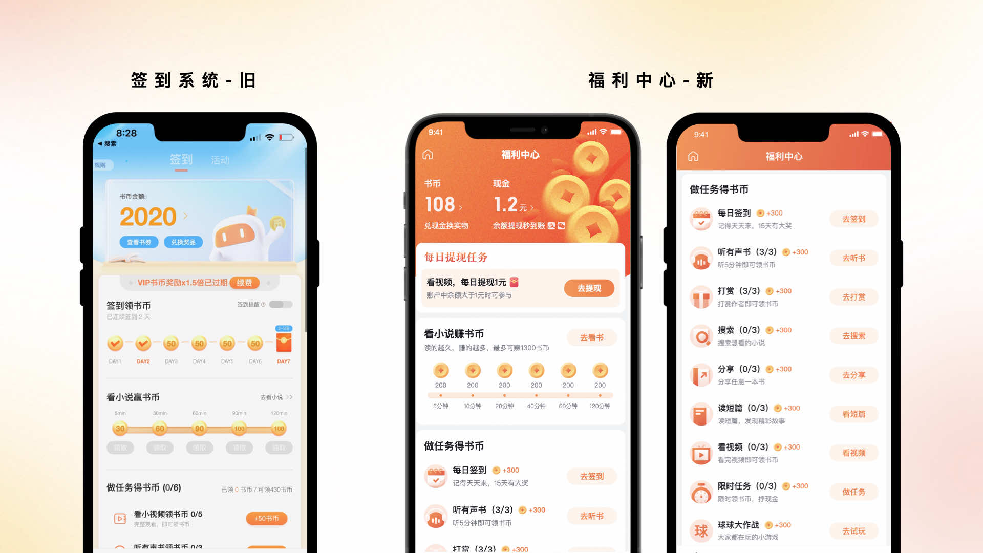 以人為本的設(shè)計(jì)能夠讓用戶在產(chǎn)品中獲得成就和滿足感,從而形成愉悅的產(chǎn)品體驗(yàn)。為了讓用戶能夠獲得滿足的感受,我們將舊版的簽到系統(tǒng)升級為金幣激勵(lì)體系,采用做任務(wù)賺金幣的形式,增加用戶的成就感。