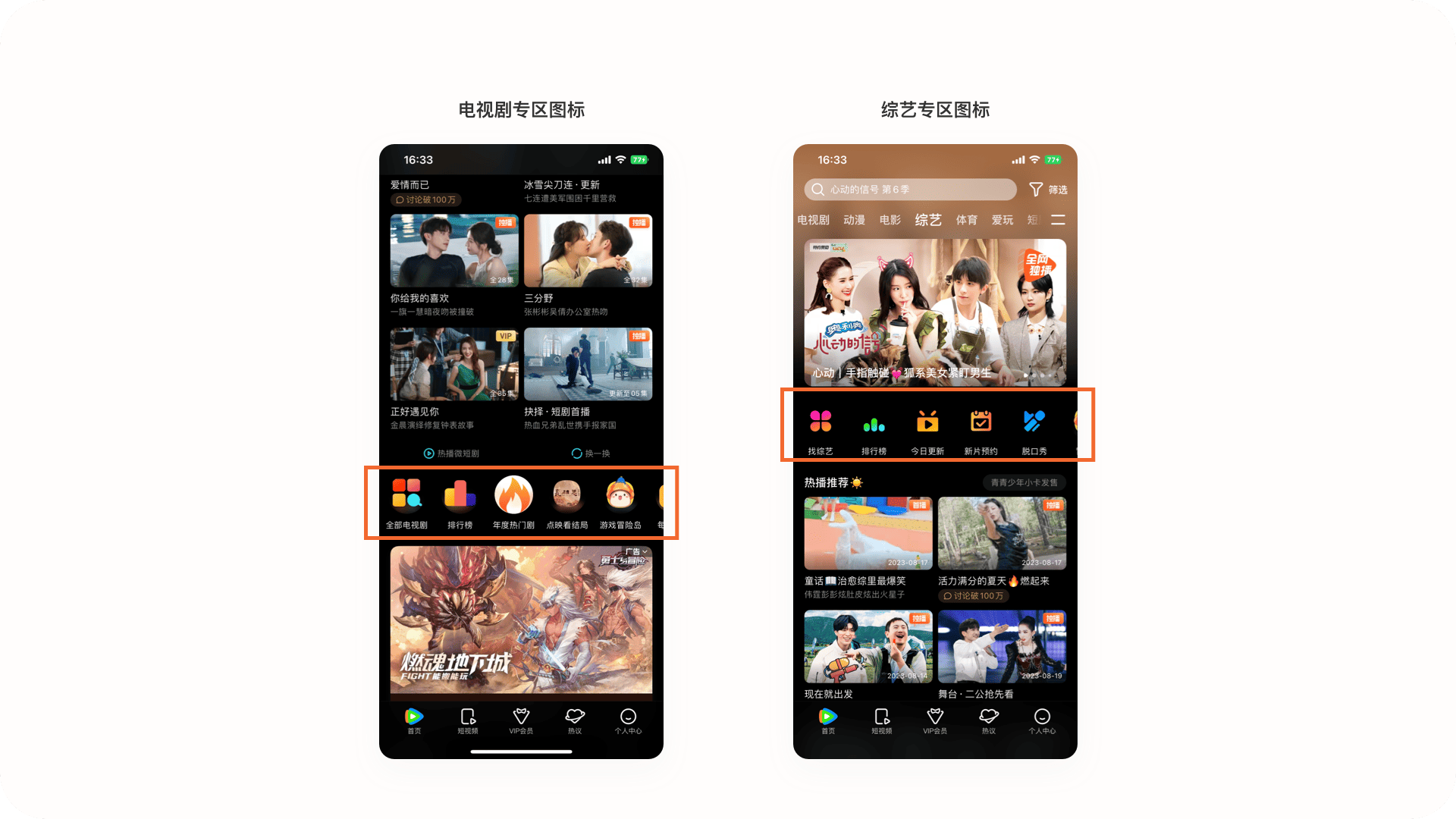 2.2.5設(shè)計(jì)誤區(qū):分區(qū)中的入口icon設(shè)計(jì)電視劇作為騰訊視頻的高頻點(diǎn)擊分區(qū),在頭部的icon確實(shí)有失大廠風(fēng)范,圖標(biāo)過(guò)大、視覺(jué)比例不一致、風(fēng)格不統(tǒng)一等問(wèn)題,很影響界面的視覺(jué)美感,但入口的點(diǎn)擊轉(zhuǎn)化是否有影響未知。