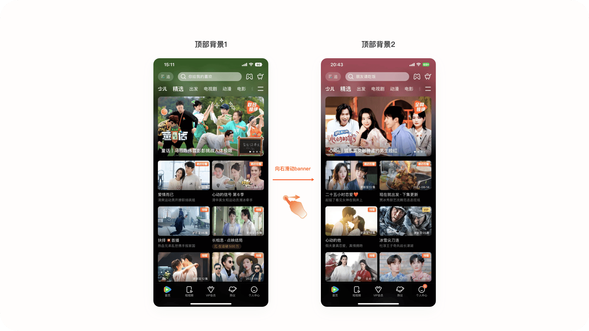 2.1.4設(shè)計(jì)亮點(diǎn):頂部背景跟隨banner顏色進(jìn)行變化頂部背景跟隨banner進(jìn)行變化,當(dāng)用戶滑動(dòng)banner時(shí)頂部背景會(huì)跟隨banner的顏色進(jìn)行變化,這樣可以讓界面的配色看起來(lái)更加和諧,提升界面視覺(jué)一致性。同時(shí)賦予用戶體驗(yàn)驚喜感。