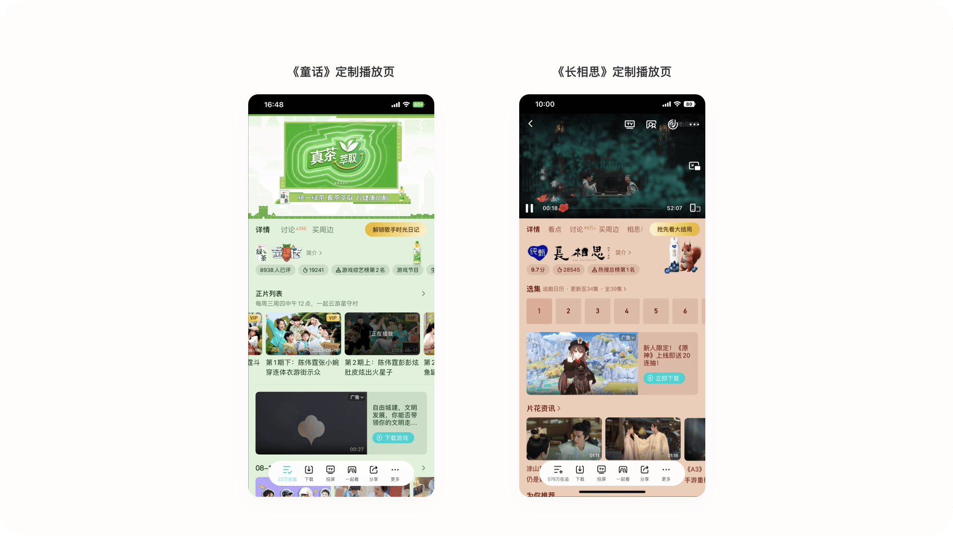 2.2.4設(shè)計(jì)亮點(diǎn):不一樣的定制化分區(qū)內(nèi)容頁(yè)騰訊視頻會(huì)根據(jù)站內(nèi)的熱門內(nèi)容進(jìn)行定制化分區(qū)內(nèi)容頁(yè),雖然這種形式在各個(gè)視頻平臺(tái)都有設(shè)計(jì),但騰訊視頻的似乎更加與眾不同,它相比其他競(jìng)品不僅增加了開(kāi)屏動(dòng)畫,加強(qiáng)界面氛圍感,同時(shí)在功能上增加了一級(jí)標(biāo)題,如在長(zhǎng)相思專題中的“獨(dú)家花絮、有聲書、看微綜、相思榜”等入口,可以讓用戶在頁(yè)面中發(fā)現(xiàn)更多劇情本身以外的衍生內(nèi)容,一級(jí)標(biāo)題的形式也可以讓用戶直達(dá)視頻播放頁(yè),快速了解想要看到的視頻內(nèi)容。