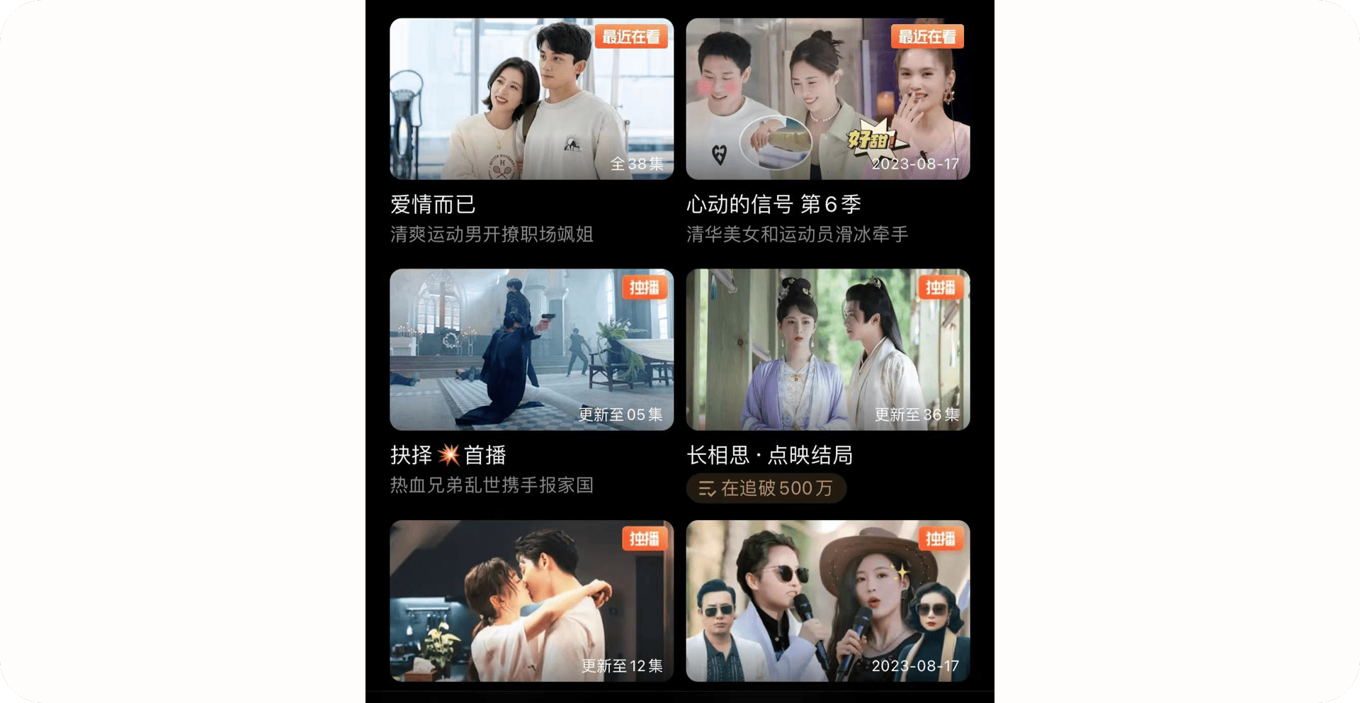2.2.2產(chǎn)品亮點(diǎn):雙瀑布流推薦機(jī)制banner下方共6個(gè)雙瀑布流推薦位,這種排列方式可以在一屏中展示更多的信息,但不足就是如果界面全部都是這種排列方式會(huì)導(dǎo)致用戶瀏覽成本提高,降低用戶的瀏覽欲望,所以騰訊視頻把內(nèi)容控制在6個(gè),不會(huì)給用戶增加瀏覽負(fù)擔(dān),其次在推薦機(jī)制上對(duì)前兩個(gè)卡片進(jìn)行“最近在看”標(biāo)簽,和視頻預(yù)覽,相比其他靜態(tài)卡片可以讓用戶更加快速的發(fā)現(xiàn)自己想看的內(nèi)容。