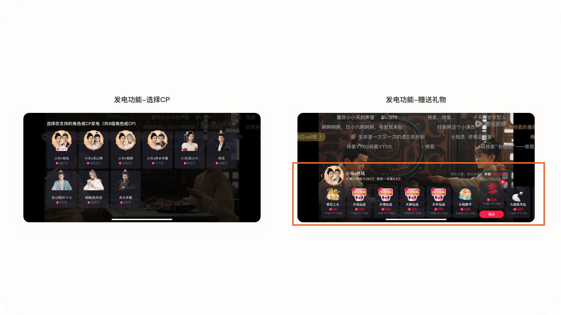 3.2.2產(chǎn)品亮點(diǎn):發(fā)電功能為自己支持的CP上分在底部操作區(qū)增加發(fā)電功能,用戶可以點(diǎn)擊為自己支持的cp送出禮物,不僅可以滿足用戶的“嗑CP”心理,同時(shí)對(duì)直播場(chǎng)景中的核心送禮功能很好的結(jié)合到視頻產(chǎn)品中,給視頻內(nèi)容提供了商業(yè)價(jià)值,提高產(chǎn)品收入。