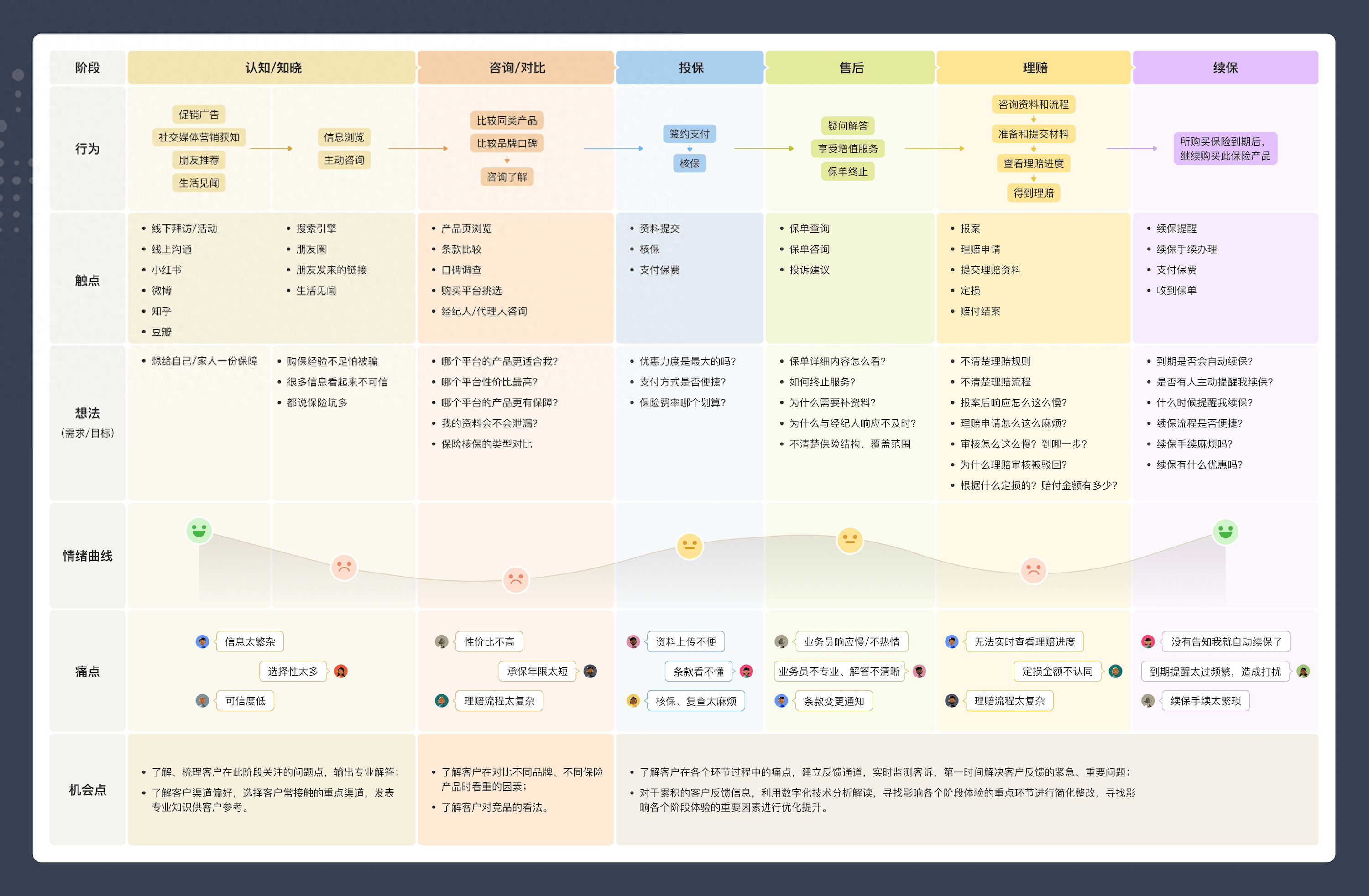 用戶旅程圖的應(yīng)用廣泛,不僅可以幫助我們進(jìn)行流程分析,還可以識(shí)別痛點(diǎn),定義問題域。同時(shí),它也可以幫助我們進(jìn)行用戶反饋的收集和整理,為產(chǎn)品或服務(wù)的優(yōu)化提供依據(jù)。然而,用戶旅程圖并不是一種一次性的工具。它需要我們不斷地更新和完善,以適應(yīng)不斷變化的市場(chǎng)和用戶需求。因此,即使我們所屬的團(tuán)隊(duì)沒有特別完善,也許我們?cè)诤荛L時(shí)間內(nèi)都沒有運(yùn)用的環(huán)境,但是不要忘記,它依然是一個(gè)威力無比的工具。