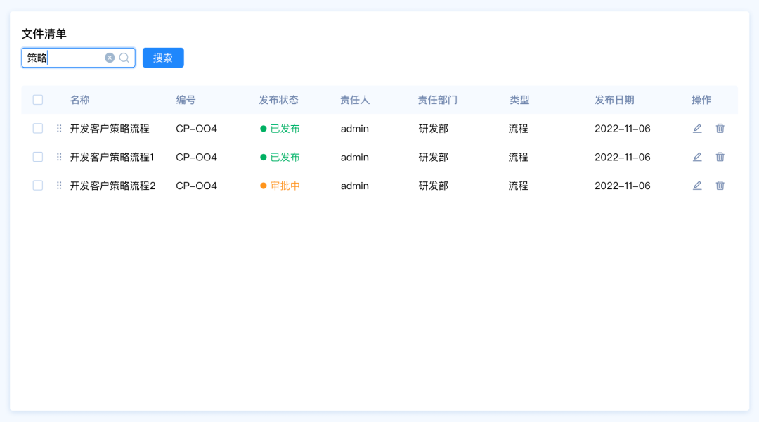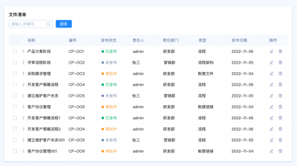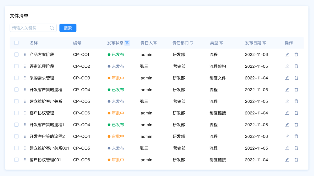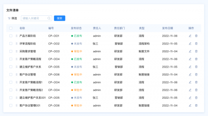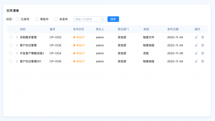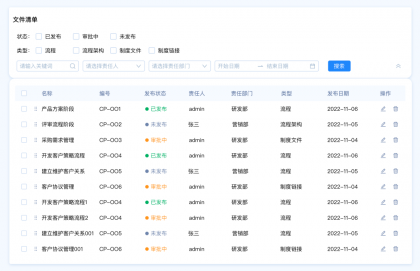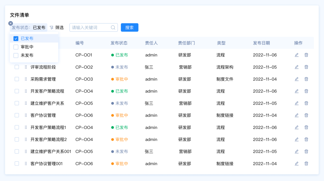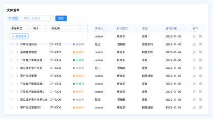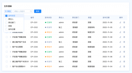 設(shè)計要點:由于這里包含多種篩選類型,名稱和編號是關(guān)鍵詞篩選,發(fā)布狀態(tài)和、責任人、責任部門、類型是選項篩選,發(fā)布日期是時間區(qū)間篩選。所以我們需要采用組合篩選的模式。