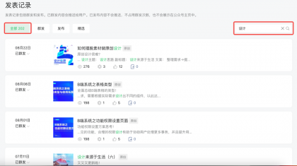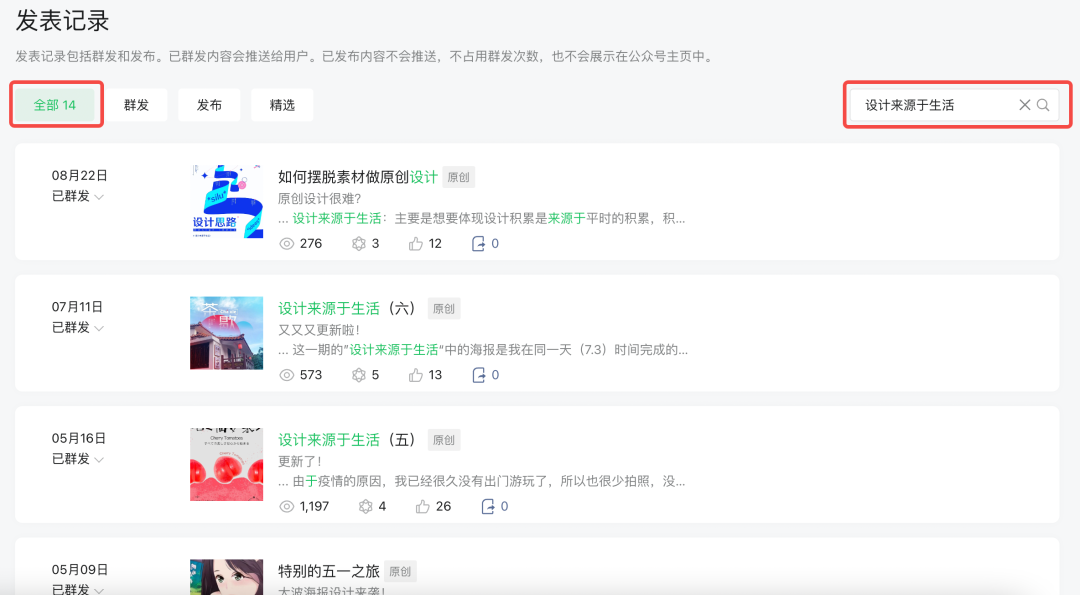 例如在微信公眾號發(fā)表記錄中的搜索,當只輸入“設(shè)計”關(guān)鍵詞時,搜索結(jié)果一共有202條,需要在這202條數(shù)據(jù)中找到自己的目標值是比較難的。