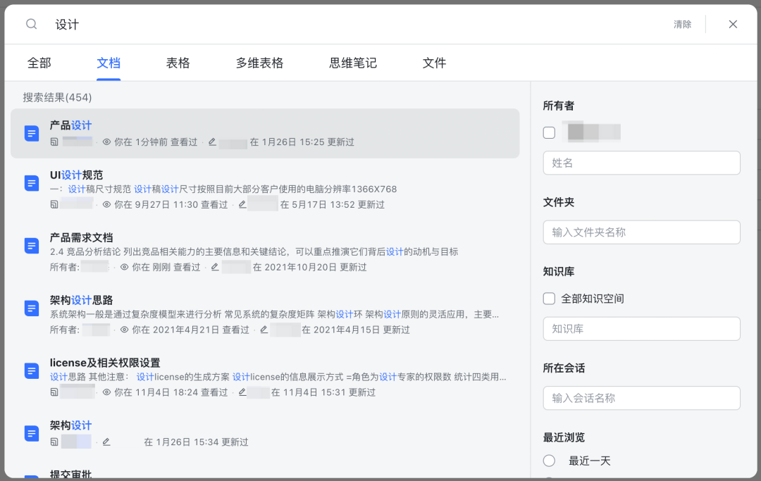 例如:在飛書文檔中,通過搜索關(guān)鍵詞后,分別展示該關(guān)鍵詞在文檔、表格、多維表格、思維筆記、文件五大類別中展示結(jié)果集,用戶通過類別區(qū)分,再縮小范圍尋找目標值。