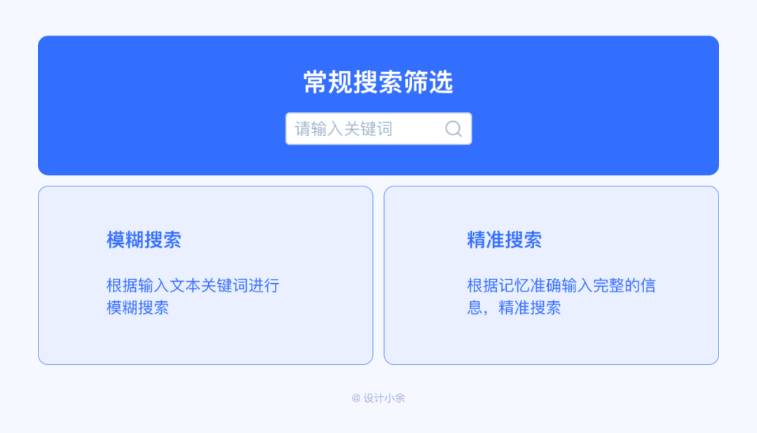常規(guī)的搜索篩選不難理解,即常見的搜索框,根據(jù)輸入文本關(guān)鍵詞進行模糊搜索或者根據(jù)記憶準確輸入完整的信息,精準搜索。文本關(guān)鍵詞搜索需要通過用戶的記憶來完成,只有當用戶對需要搜索的內(nèi)容(關(guān)鍵詞)有記憶才能完成搜索篩選,搜索的結(jié)果范圍根據(jù)關(guān)鍵詞的精準度而定。