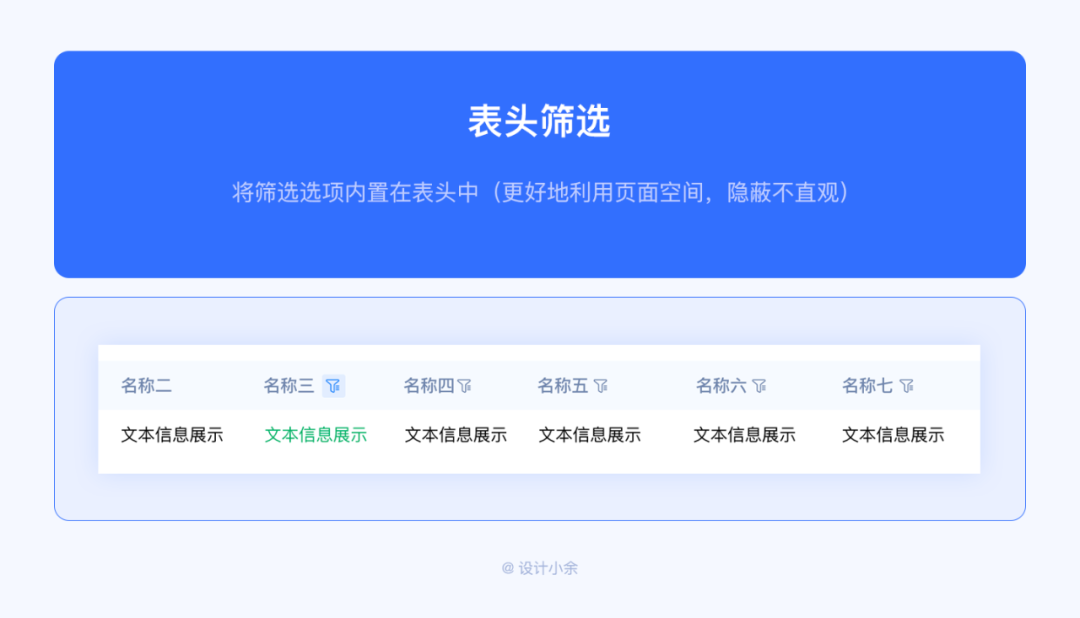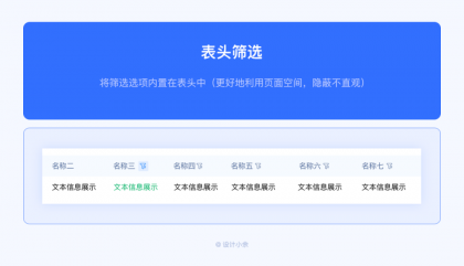 將篩選選項內(nèi)置在表頭中(更好地利用頁面空間,隱蔽不直觀)。當頁面空間有限時,可以考慮此方案。另外當表格表頭字段數(shù)據(jù)較多時,需要橫向滑動查看數(shù)據(jù)時,建議還是直接將篩選條件單獨放在外面?;蛘弋斝枰Y選的選項太多時,表頭字段都能篩選時,也可以考慮放在表頭中。