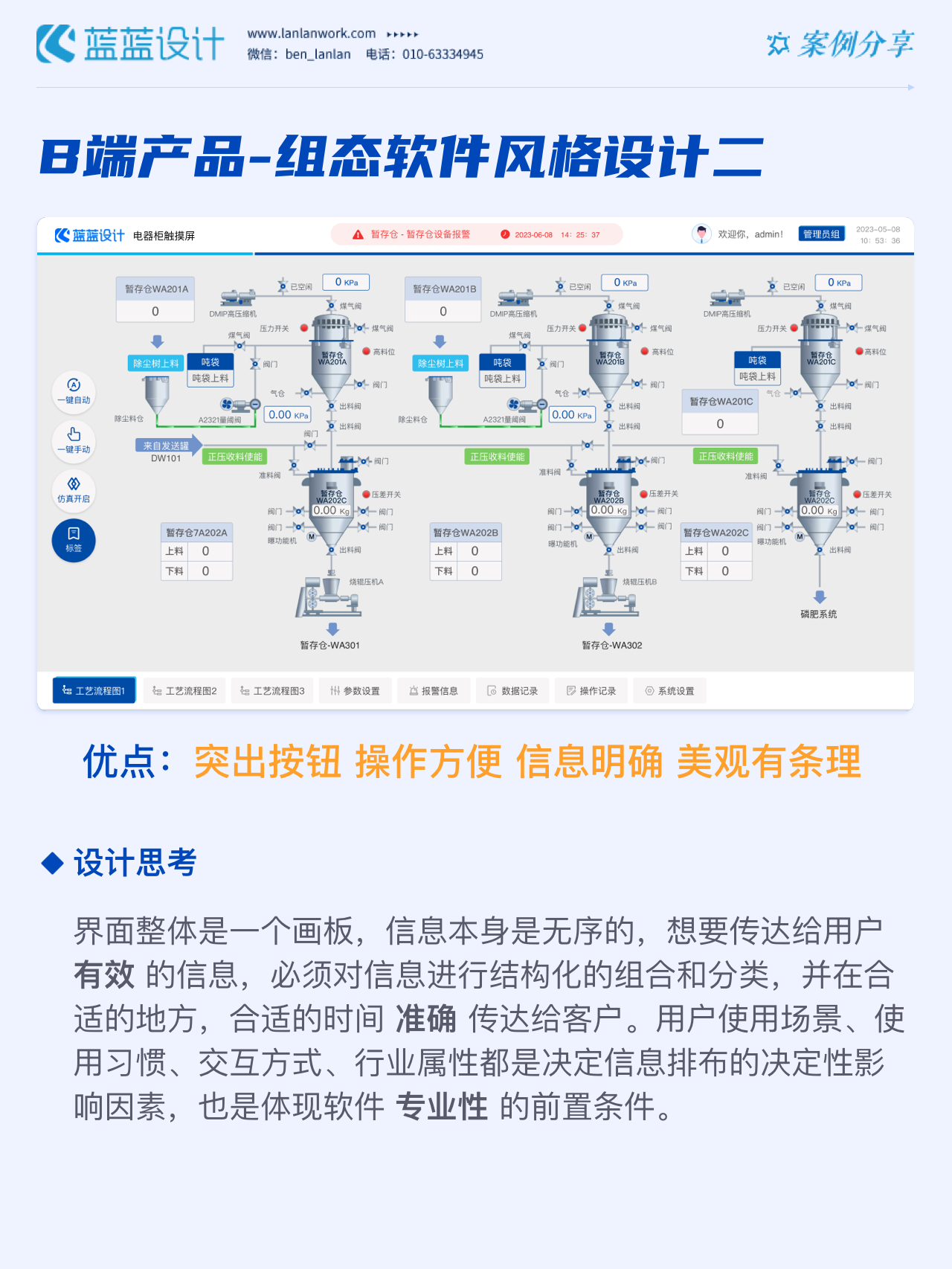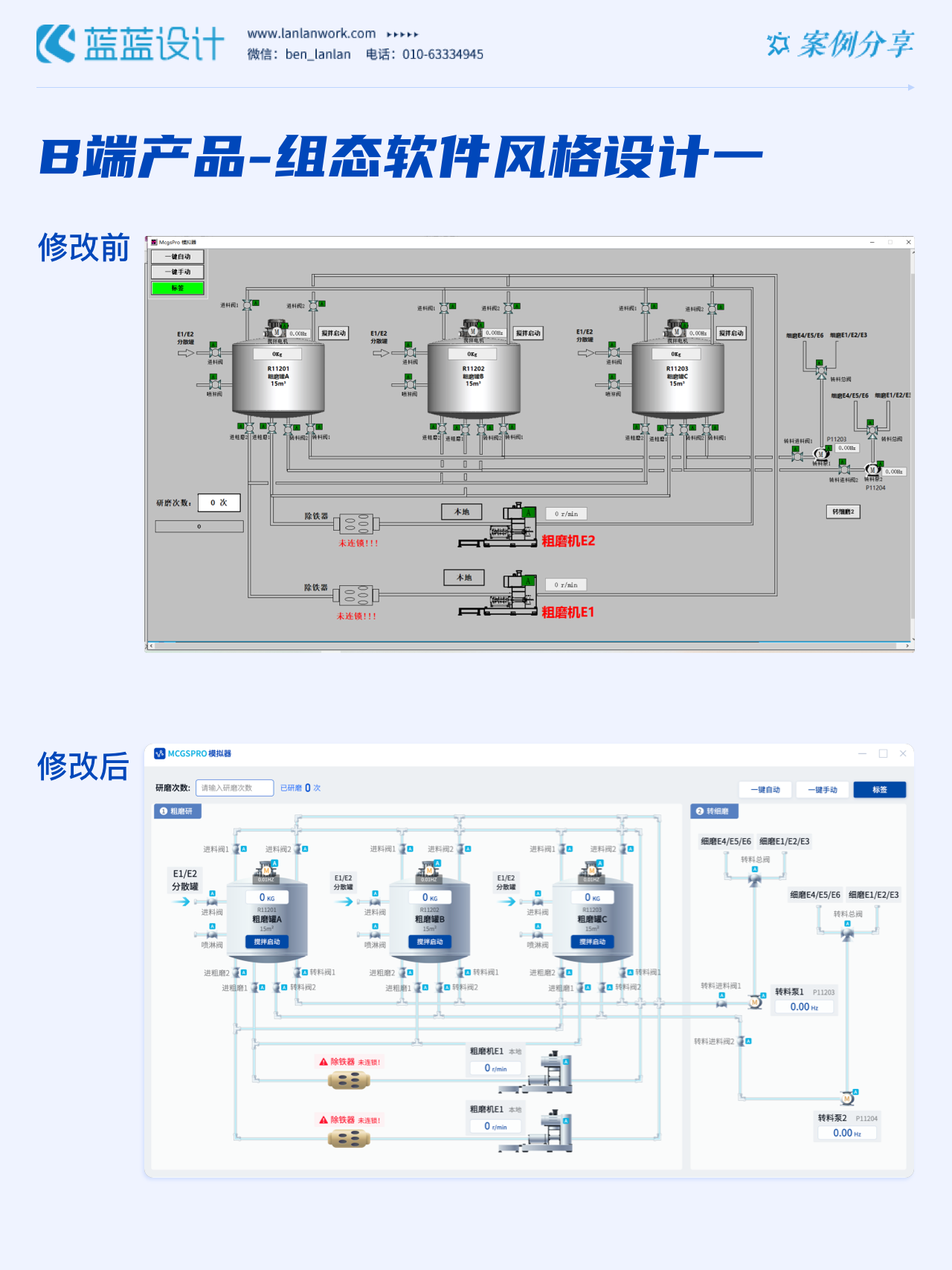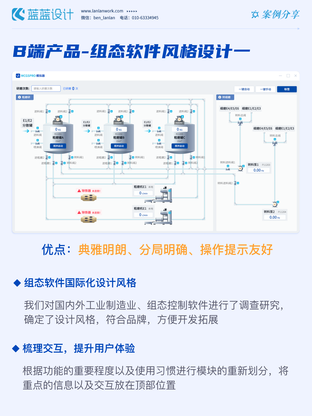 藍藍設(shè)計的兩種組態(tài)軟件風(fēng)格都采用符合當(dāng)下審美潮流的2D插畫效果,既保證了視覺效果美觀的同時也降低落地成本,方便后續(xù)的拓展、修改、提升與設(shè)計效率,同時注重用戶的閱讀習(xí)慣,將原功能點重新布局,主次內(nèi)容對比明顯,降低視覺噪音,保證清晰順暢的操作,提升用戶體驗!