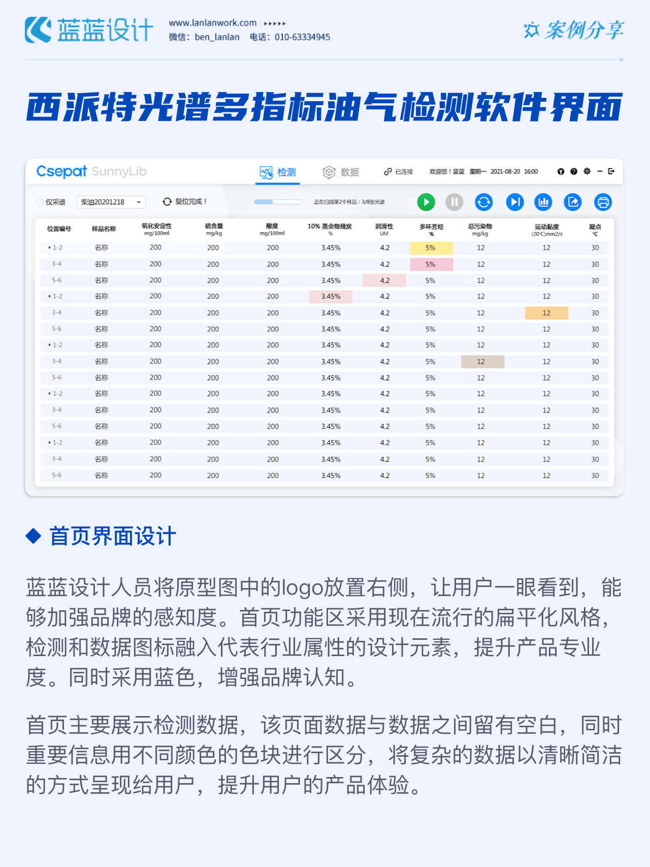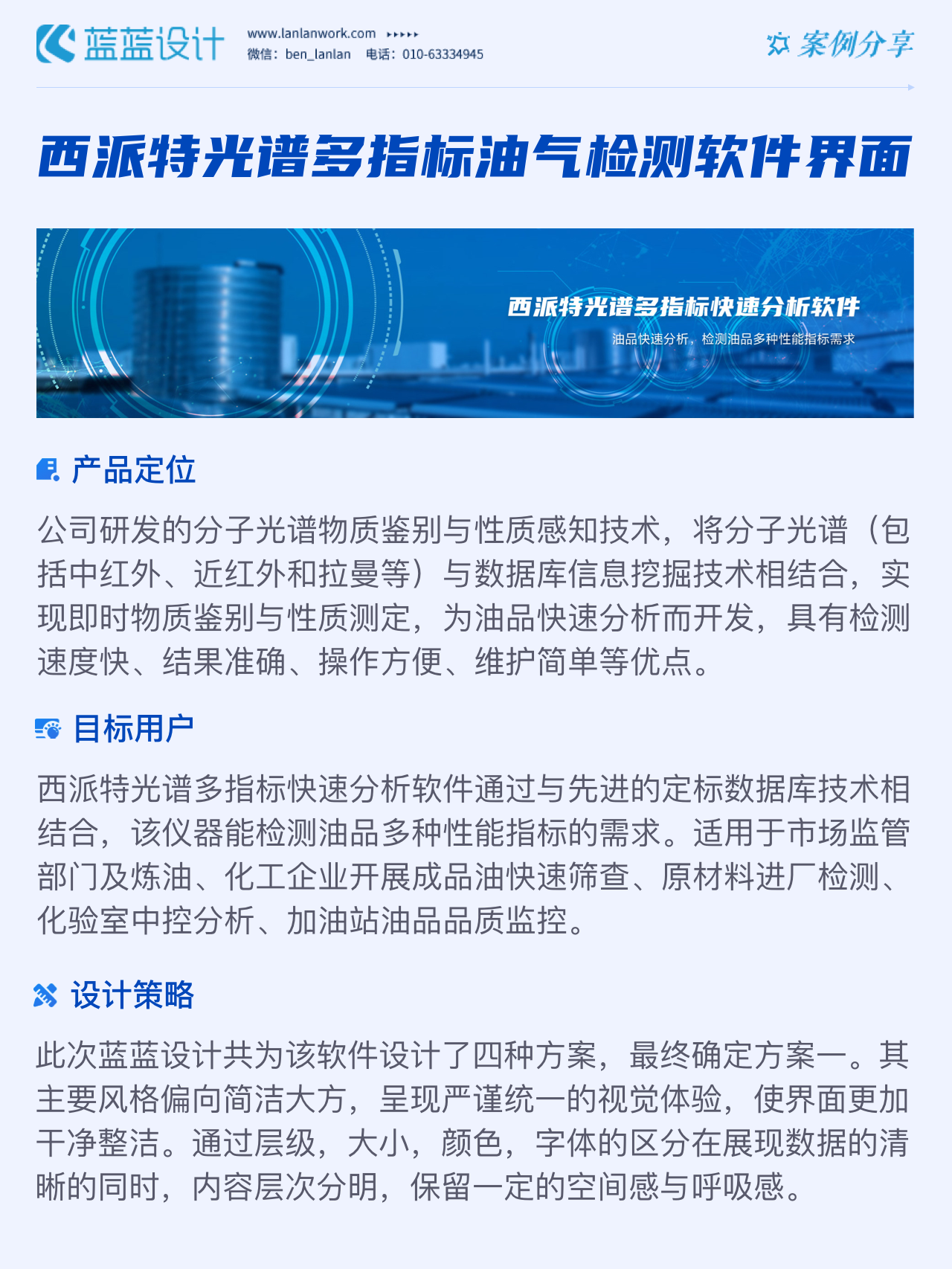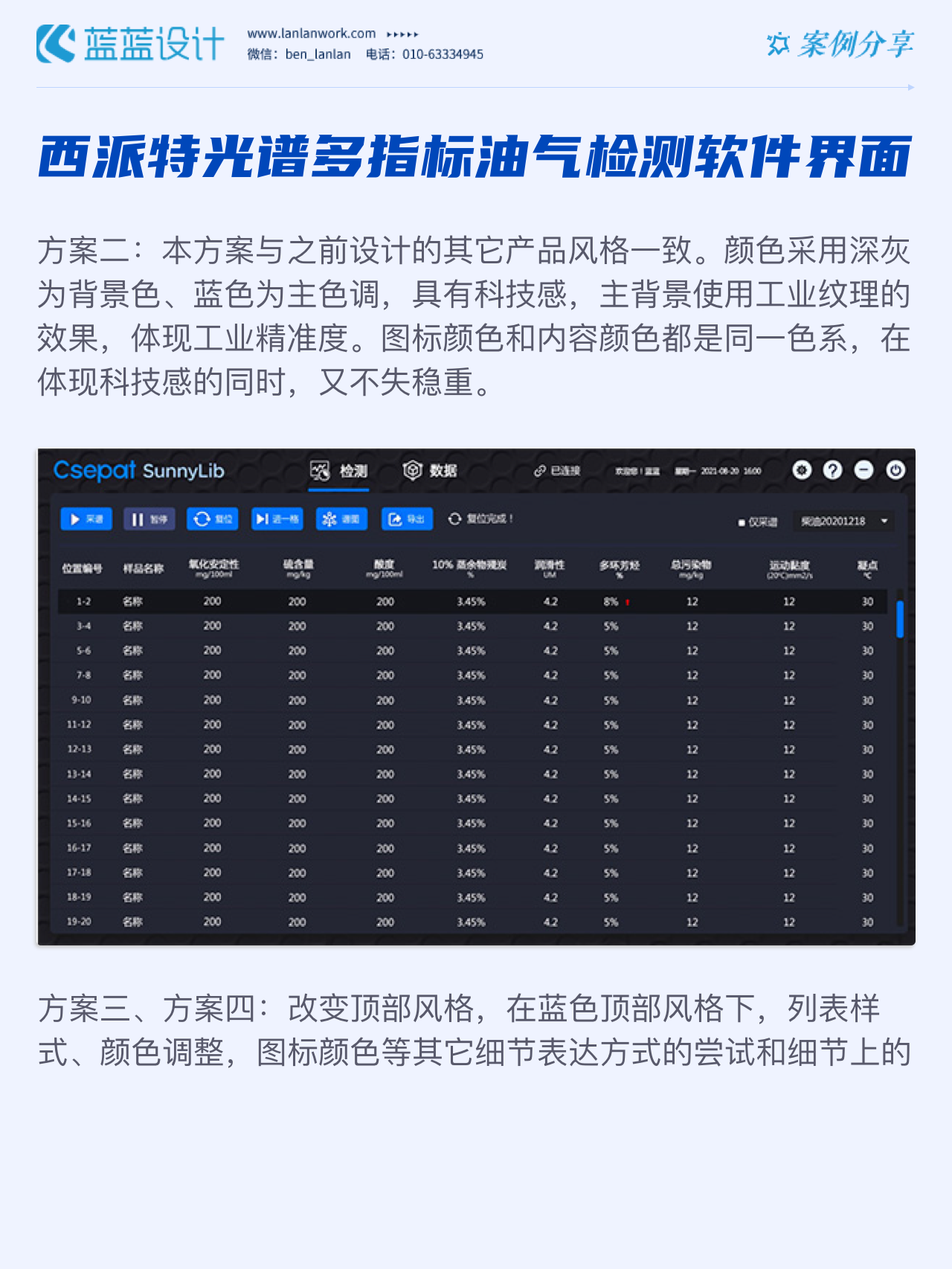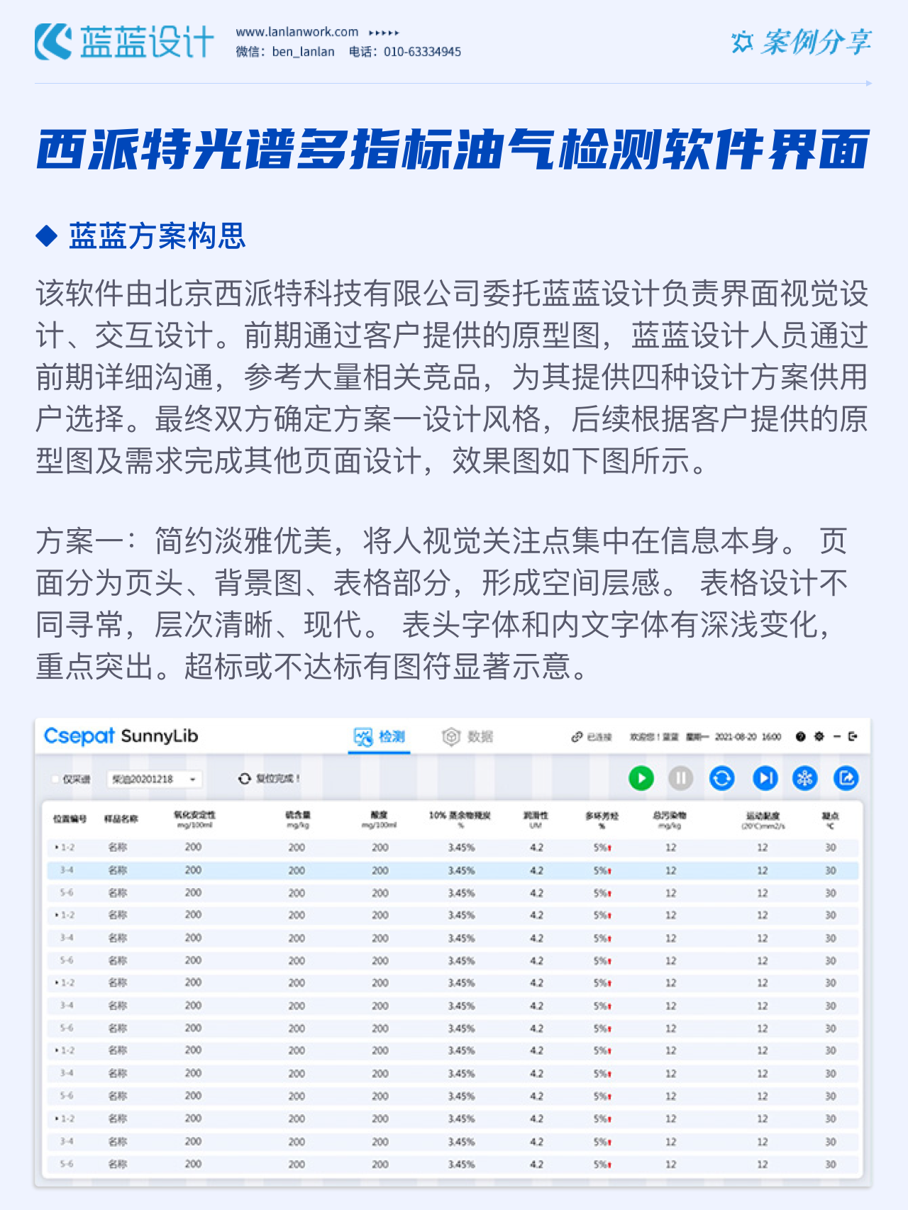 該軟件由北京西派特科技有限公司委托藍(lán)藍(lán)設(shè)計負(fù)責(zé)界面視覺設(shè)計、交互設(shè)計。藍(lán)藍(lán)設(shè)計人員通過前期詳細(xì)溝通,參考大量相關(guān)競品,為其提供四種方案視覺設(shè)計。最終雙方確定方案一設(shè)計風(fēng)格,后續(xù)根據(jù)客戶提供的原型圖及需求完成其他頁面設(shè)計。