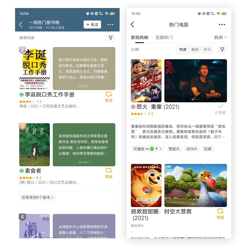 豆瓣的電影榜單設(shè)計(jì)非常巧妙:豎幅圖片完美展示電影海報(bào),橫幅區(qū)域則用于劇照輪播。這種豎橫搭配不僅視覺和諧,還能比單圖展示更高效地利用空間。這個(gè)設(shè)計(jì)模式同樣適用于圖書榜單,橫幅區(qū)域可以展示書評(píng)。通過呈現(xiàn)豐富的信息,用戶能在列表頁就對(duì)內(nèi)容有更全面的了解,從而提高查看詳情頁的意愿。