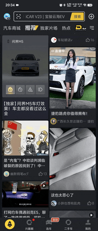 如今各大 APP 的信息流千篇一律,都是圖文、視頻、廣告的組合,用戶在不斷滑動(dòng)中逐漸失去了新鮮感。懂車帝巧妙地為了推廣自家的在線 3D 看車功能,為信息流帶來了全新玩法!他們?cè)谑醉撔畔⒘髦星度肓丝山换サ?3D 汽車模型,這種既能觀看又能操作的創(chuàng)新形式,與傳統(tǒng)的圖文視頻形式形成鮮明對(duì)比,立即吸引了用戶的注意力,讓人忍不住想要嘗試。