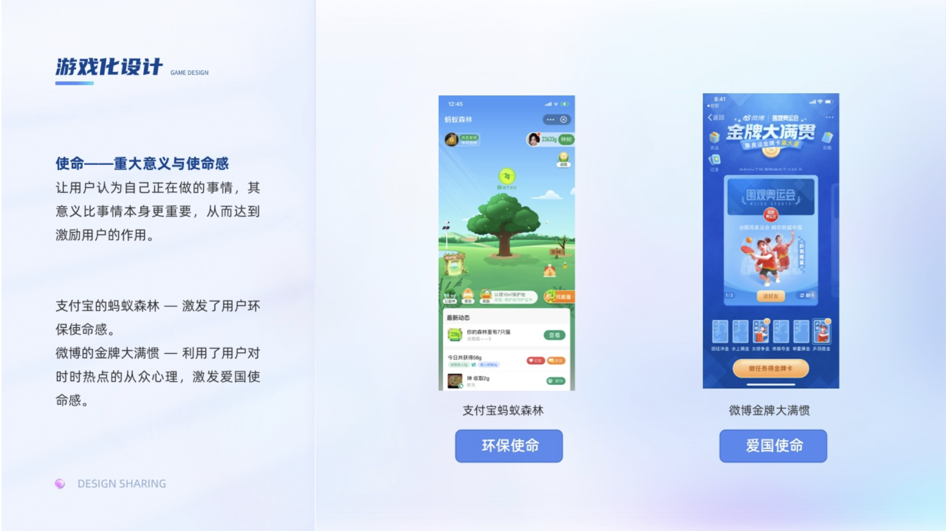 讓用戶認為自己正在做的事情,其意義比事情本身更重要,從而達到激勵用戶的作用。譬如支付寶里面的螞蟻森林,種的不是樹,而是地球的一點綠,這個使命感瞬間油然而生,在玩的過程中還能幫助地球綠化,激發(fā)了用戶環(huán)保使命感。再比如在奧運期間的微博的金牌大滿慣的活動,以圍觀奧運會之名,集奧運金牌卡喊你助威中國,利用了用戶對時時熱點的從眾心理,又聯(lián)系到了愛國上升了到了愛國使命感。
