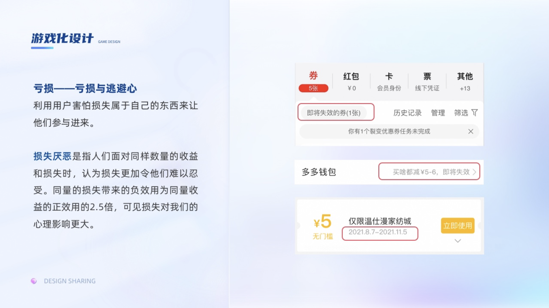 利用用戶害怕?lián)p失屬于自己的東西來讓他們參與進來。可以結合損失厭惡來理解。損失厭惡是指人們面對同樣數(shù)量的收益和損失時,認為損失更加令他們難以忍受。同量的損失帶來的負效用為同量收益的正效用的2.5倍,可見損失對我們的心理影響更大。比如商家發(fā)給你的免費優(yōu)惠券,其實你本身不需要購買什么,但是商家偏偏在優(yōu)惠券上加上時效性,超過活動日期就置灰了,即使你原本沒有購買需求,但是感覺沒用掉優(yōu)惠券就像損失了優(yōu)惠券的錢一樣,就會去購買,甚至為了湊單購買更多東西。