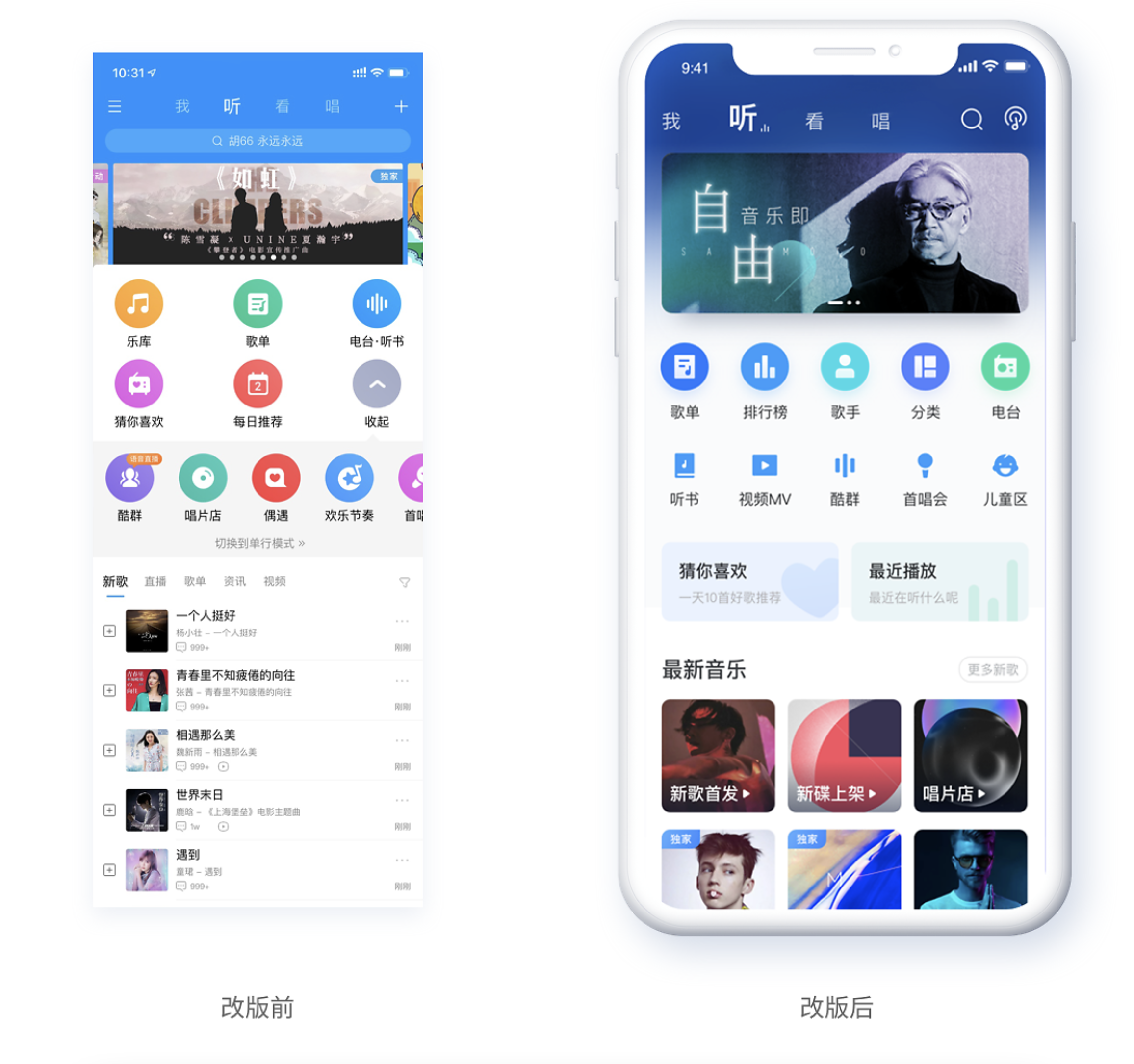 • 分析落地:根據(jù)資料和用戶畫像,確定設(shè)計(jì)目標(biāo),比如酷狗音樂改版要突出品牌感、提升界面年輕化和娛樂性。