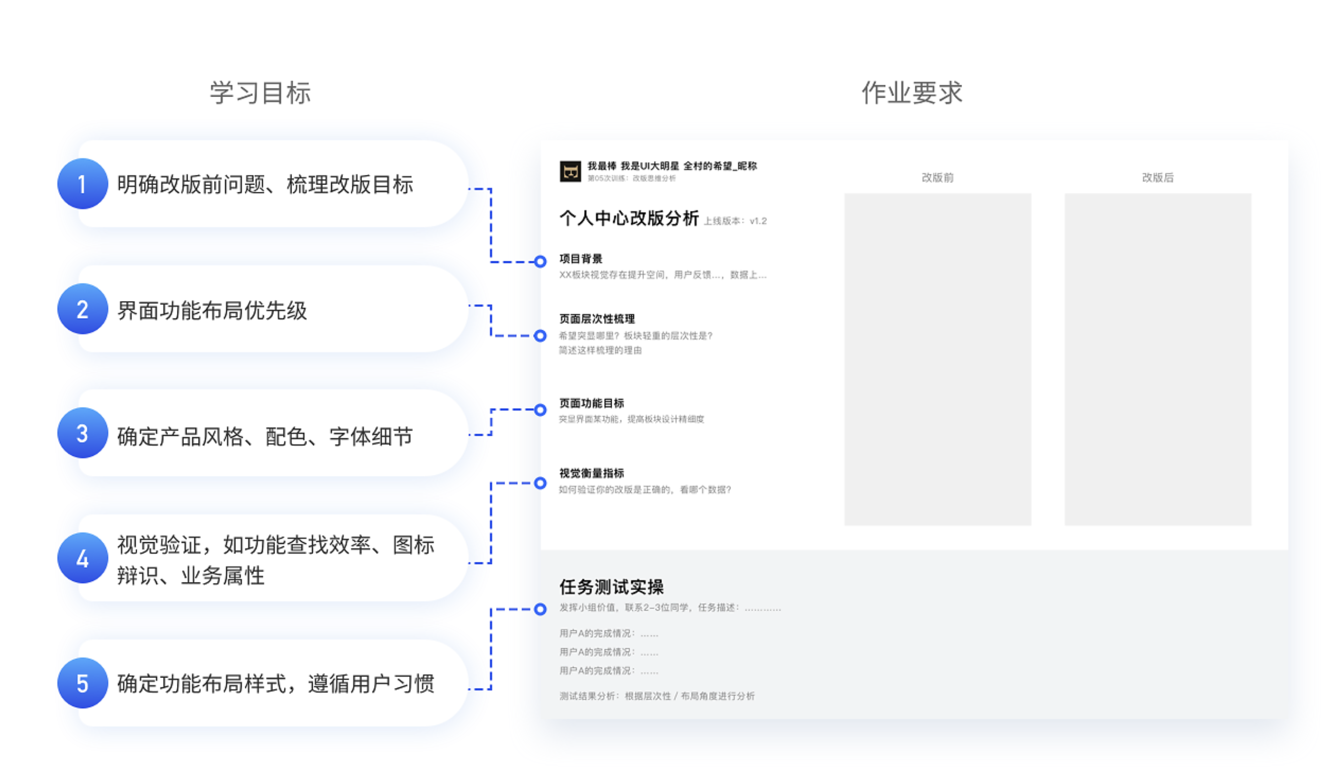 • 科學(xué)的作業(yè)體系包括明確改版前的問題、梳理改版目標(biāo)、確定頁(yè)面層次性和功能目標(biāo)、進(jìn)行任務(wù)測(cè)試等,從每次作業(yè)中培養(yǎng)設(shè)計(jì)思維。