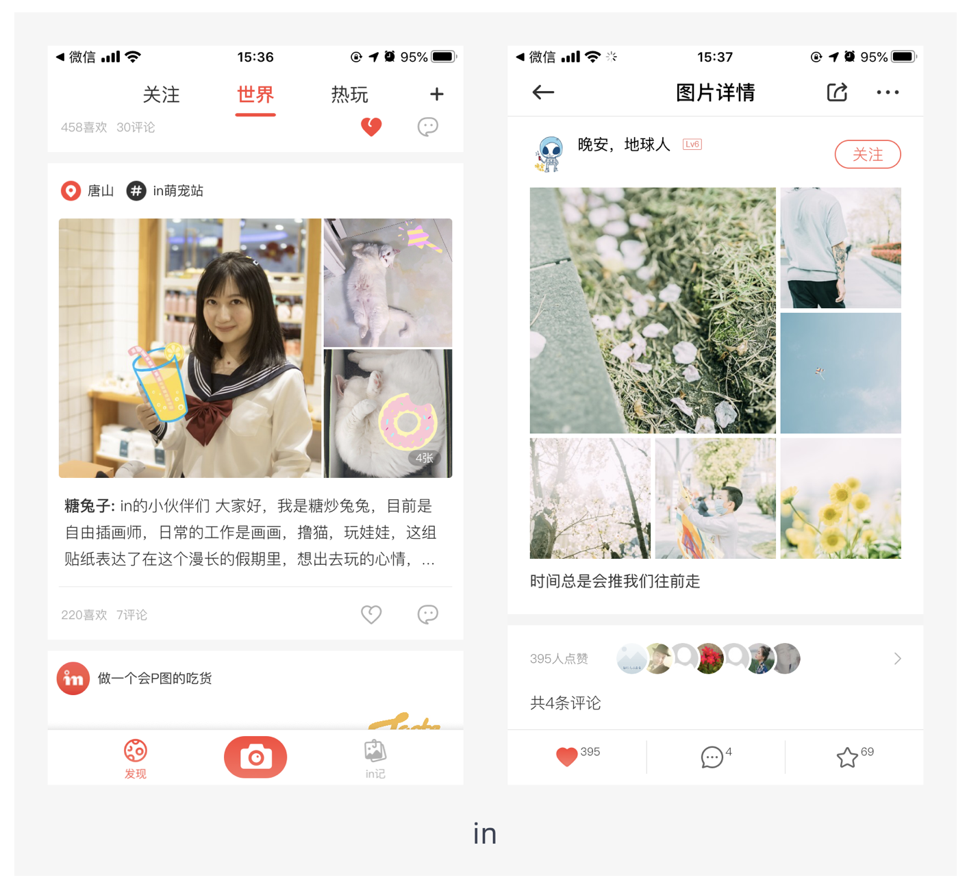 - 隨圖片而變化:當(dāng)用戶上傳不同比例的圖片時(shí),圖片展示寬度為屏幕寬度,展示高度根據(jù)確定的寬度等比例縮放。這種適配方式能將圖片信息表達(dá)完善,但圖片占用空間大,適合圖片質(zhì)量高、用戶以瀏覽圖片為主的產(chǎn)品,如圖蟲。不過需要注意的是,采用該方式需要設(shè)置最大最小閾值,當(dāng)圖片的高度超過一定數(shù)值,高度就不再增加,當(dāng)圖片的高度小于一定數(shù)值,高度不再減小。