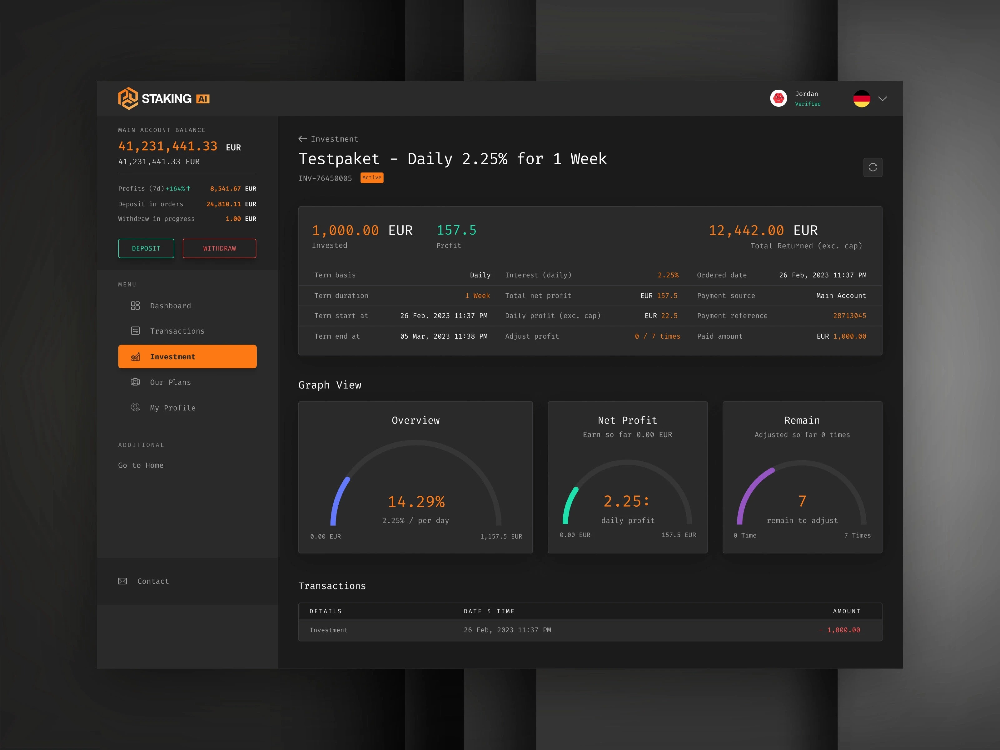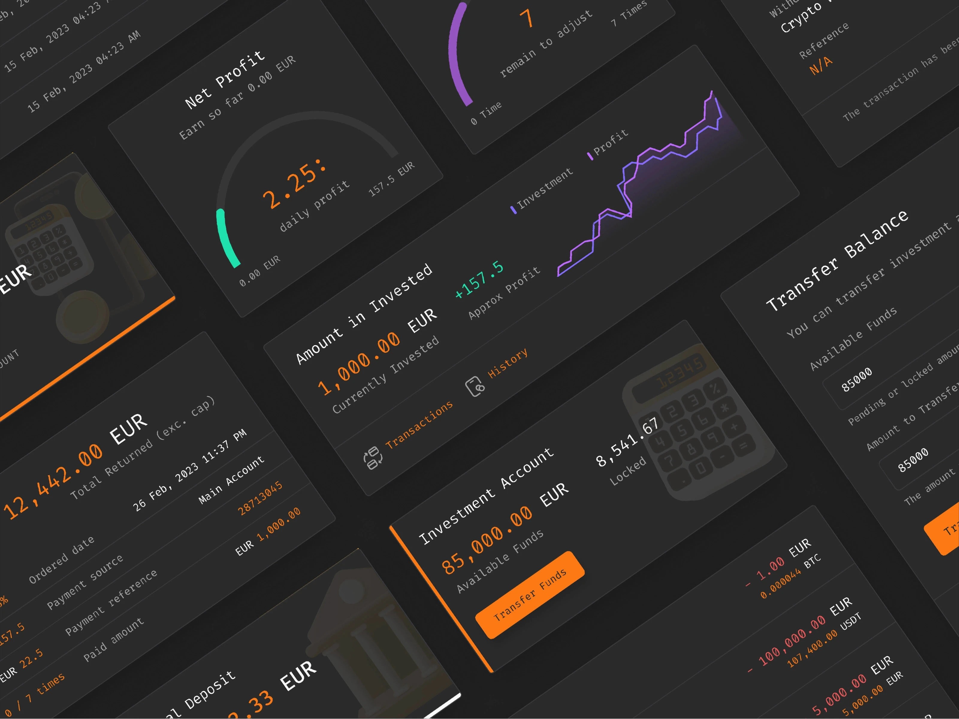 視覺風(fēng)格:以深灰 / 黑色為基底,通過橙色、綠色等亮色突出核心數(shù)據(jù)(如收益、資產(chǎn)余額)與交互按鈕,營造出 “專業(yè)、理性” 的金融氛圍;界面元素簡潔利落,模塊化布局清晰劃分投資賬戶、收益統(tǒng)計(jì)、資產(chǎn)分布等功能區(qū)域。