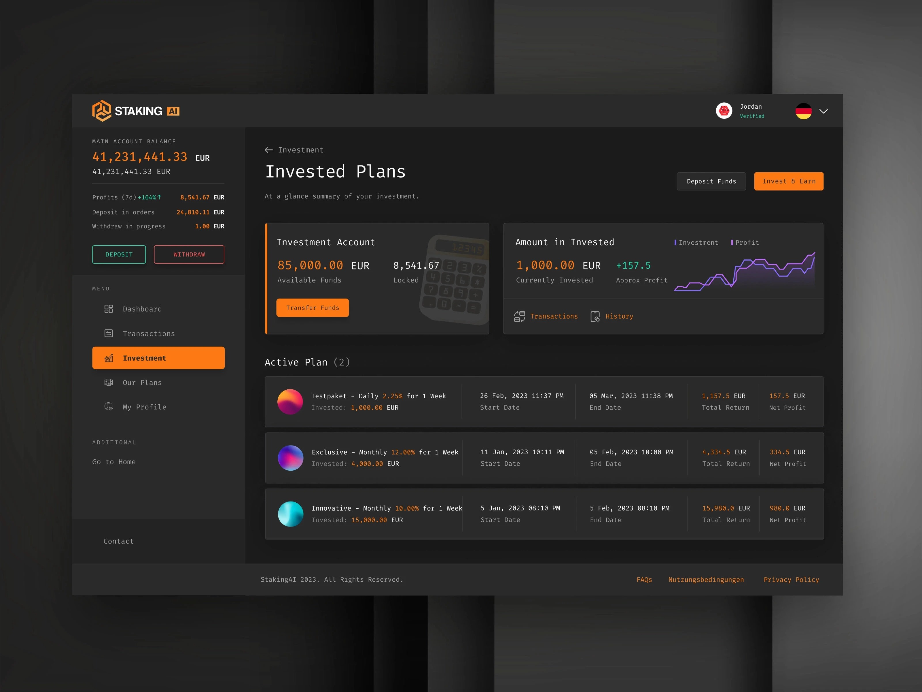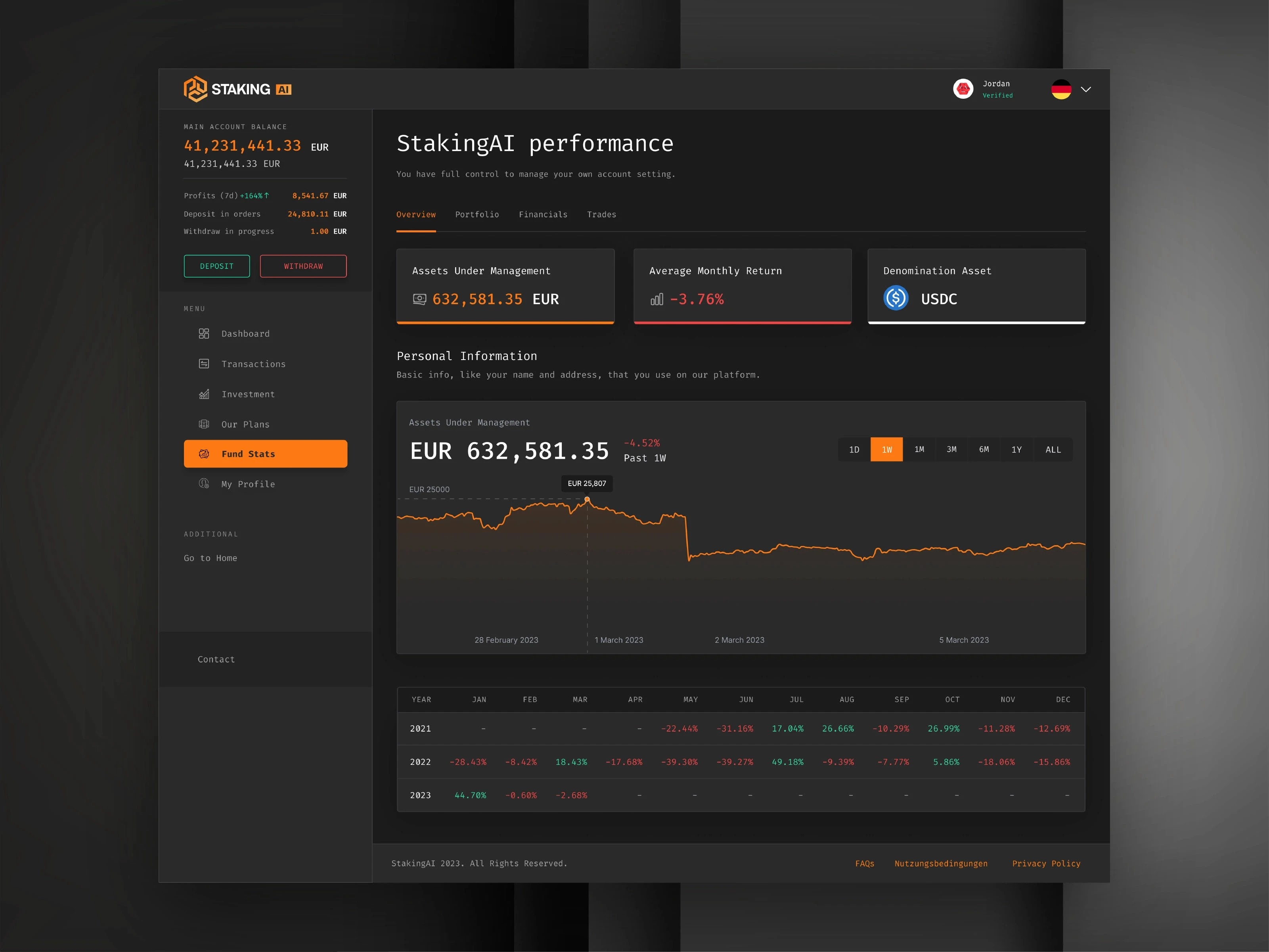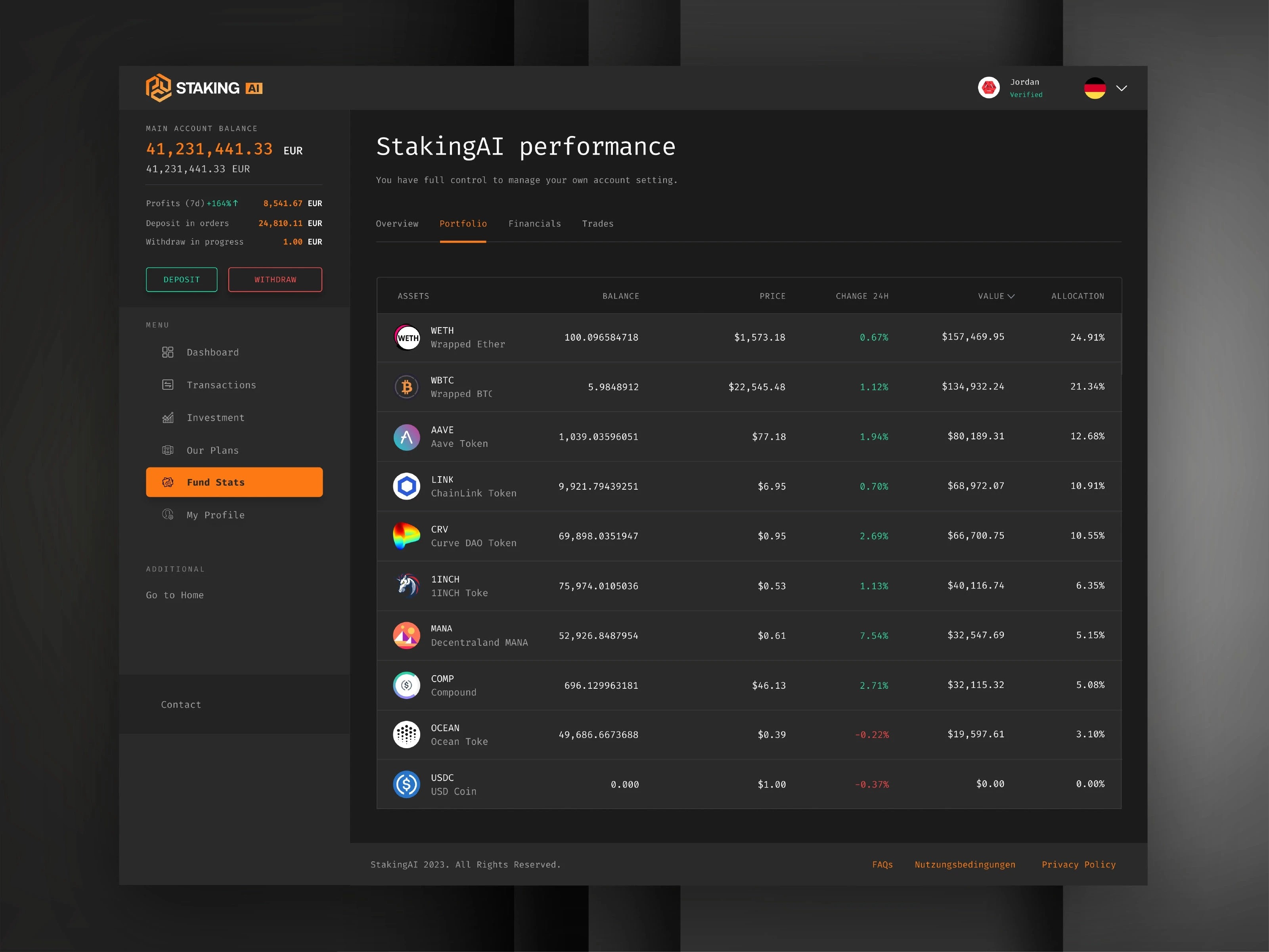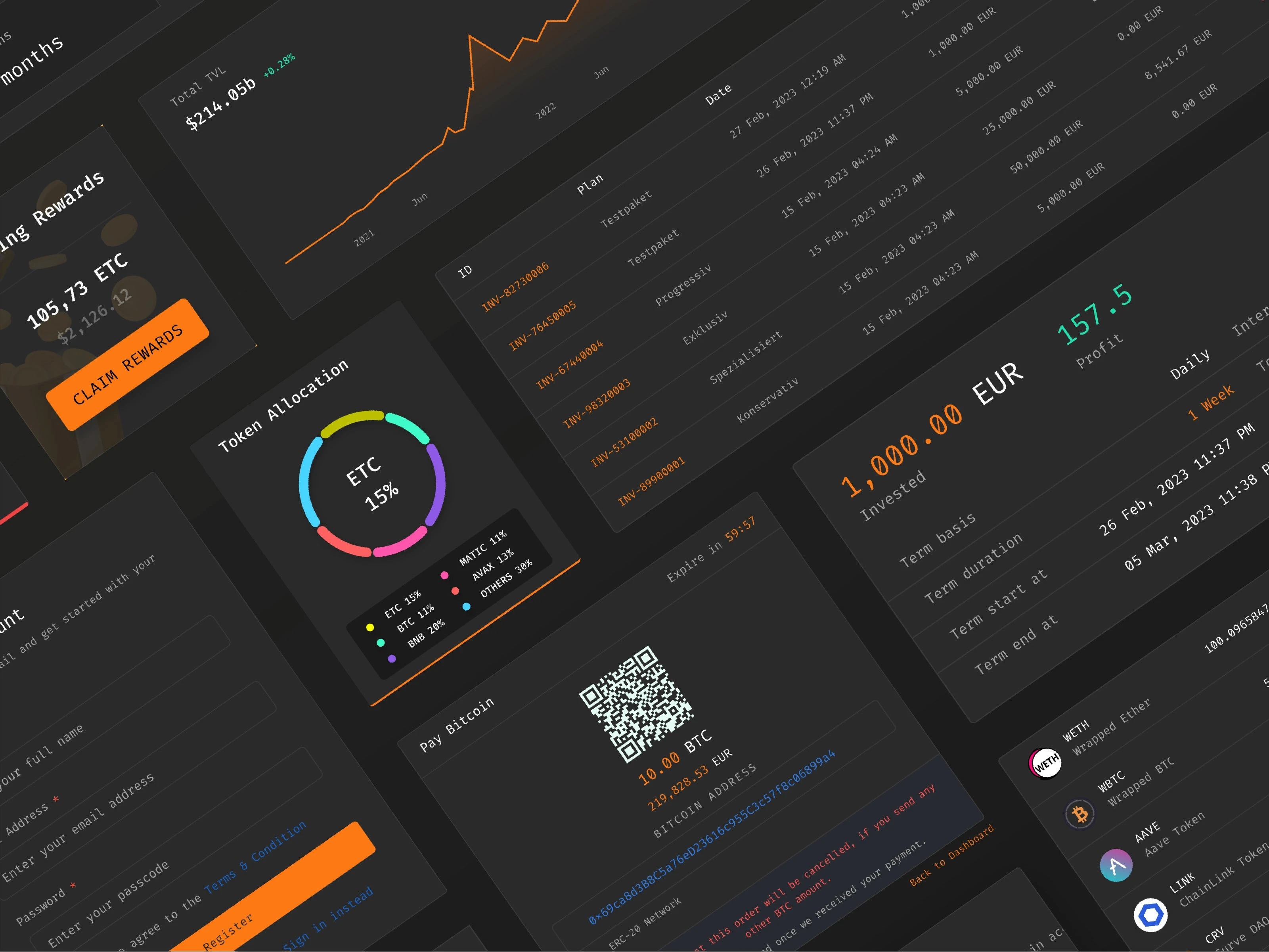 功能邏輯:聚焦 “投資全流程管理”,從資產(chǎn)充值、投資計(jì)劃、收益跟蹤到資產(chǎn)配置,全鏈路覆蓋;通過圖表(折線圖、環(huán)形圖)、數(shù)據(jù)卡片直觀呈現(xiàn)投資收益、資產(chǎn)波動、代幣占比等關(guān)鍵信息,助力用戶快速決策。