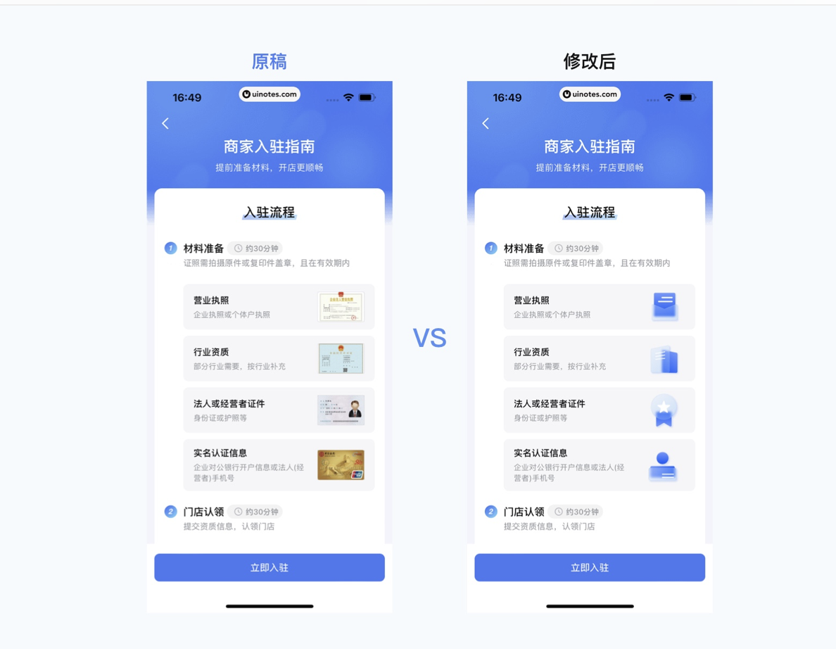 “設(shè)計稿我已經(jīng)交了,落地不好是開發(fā)的問題”,這種想法是設(shè)計師成長的最大阻礙。設(shè)計不是孤立的環(huán)節(jié),而是商業(yè)流程中的重要一環(huán),從需求對接、方案設(shè)計到落地還原,每個環(huán)節(jié)都需要設(shè)計師主動介入。曾有團隊做一款商家入駐 APP,設(shè)計師提交的方案視覺效果極佳,但多個特效超出技術(shù)實現(xiàn)范圍,反復(fù)修改后不僅延誤上線,還讓設(shè)計效果大打折扣。