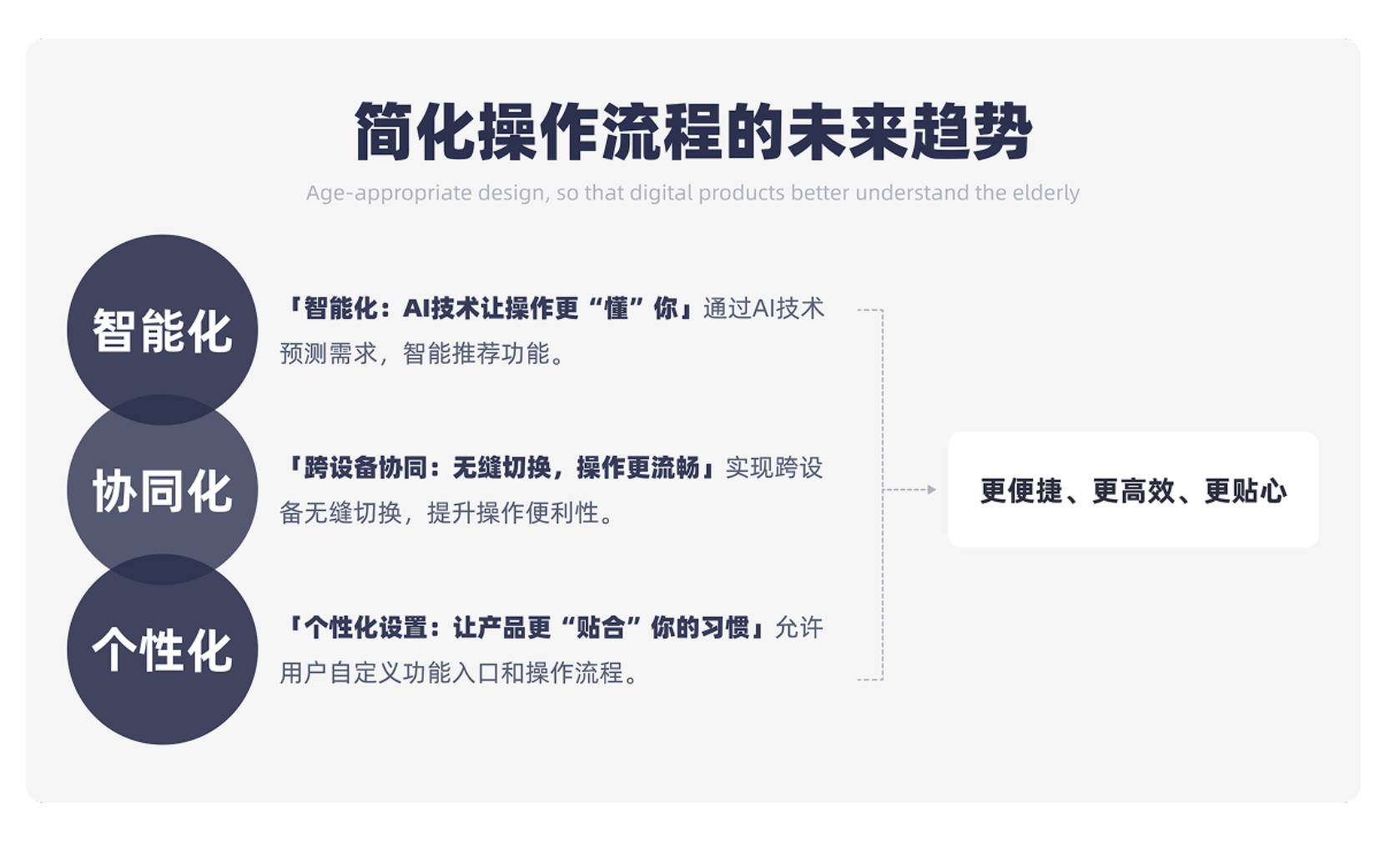 當下,適老化設(shè)計已不再是 “錦上添花” 的加分項,而是數(shù)字產(chǎn)品必須承擔的社會責任。隨著 AI 技術(shù)的發(fā)展,未來的適老化設(shè)計還將朝著智能化、協(xié)同化、個性化方向邁進 —— 通過 AI 預測老人需求,智能推薦常用功能;實現(xiàn)跨設(shè)備無縫切換,讓操作更流暢;允許用戶自定義功能入口,讓產(chǎn)品更貼合個人習慣。