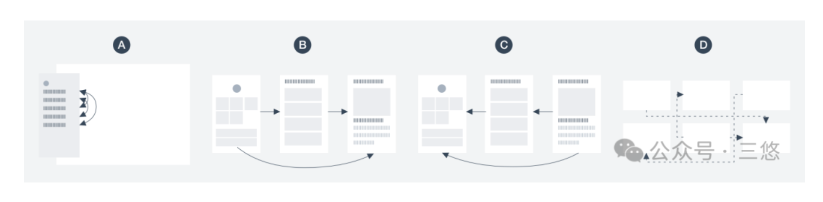 完善的導(dǎo)航體系應(yīng)支持四種核心路徑移動(dòng):同層級(jí)跳轉(zhuǎn)(平移)、進(jìn)入低層級(jí)內(nèi)容(下鉆)、返回歷史頁(yè)面或高層級(jí)(返回)、基于相關(guān)性推薦(聯(lián)想導(dǎo)航),四種路徑相互配合,覆蓋用戶的所有操作場(chǎng)景。