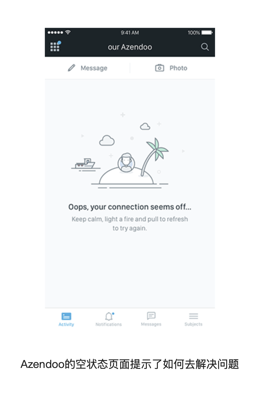 空狀態(tài)、錯誤提示頁面不應(yīng)是毫無指引的空白界面。當用戶遇到網(wǎng)絡(luò)斷開、操作失誤或內(nèi)容為空時,空白頁面會讓用戶不知所措,甚至直接退出 App。優(yōu)秀的空狀態(tài)設(shè)計應(yīng)提供明確的解決方案 —— 比如告知用戶 “網(wǎng)絡(luò)連接失敗” 后,給出 “下拉刷新重試” 的指引;內(nèi)容為空時,建議用戶 “添加第一條內(nèi)容” 并提供操作入口。某協(xié)作類 App 在網(wǎng)絡(luò)斷開時,會顯示 “連接似乎中斷了... 冷靜下來,下拉刷新再試一次” 的提示,既緩解了用戶的焦慮,又給出了具體操作路徑,有效降低了用戶流失率。