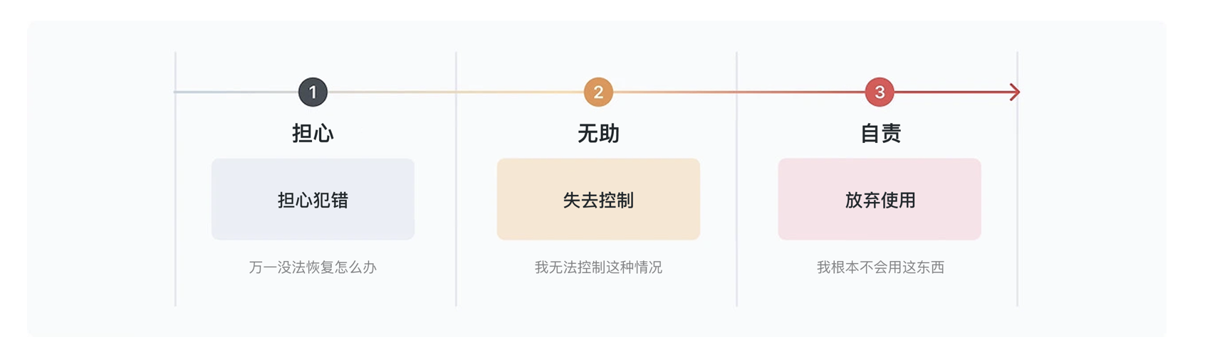要化解錯(cuò)誤帶來的負(fù)面影響,首先需要讀懂錯(cuò)誤背后的邏輯與用戶心理。從類型上看,用戶出錯(cuò)可分為 “失誤” 與 “錯(cuò)誤” 兩類:失誤多是執(zhí)行階段的無意識(shí)行為,比如分心時(shí)點(diǎn)錯(cuò)按鈕、輸入時(shí)打錯(cuò)字符;錯(cuò)誤則源于規(guī)劃階段的判斷偏差,往往是界面信息混亂、層級(jí)模糊導(dǎo)致用戶誤解功能。無論哪種情況,用戶出錯(cuò)后的心理反應(yīng)高度一致:擔(dān)心操作不可逆的恐懼、失去對(duì)流程掌控感的無助,以及將問題歸咎于自身的自責(zé),而自責(zé)感正是導(dǎo)致用戶放棄使用的核心誘因。尤其在操作不可逆(如刪除數(shù)據(jù)、注銷賬號(hào))、反復(fù)失?。ㄈ绲卿洺瑫r(shí)、表單校驗(yàn)不通過)或高風(fēng)險(xiǎn)場(chǎng)景(如支付轉(zhuǎn)賬、數(shù)據(jù)傳輸)中,用戶的焦慮感會(huì)被急劇放大,對(duì)產(chǎn)品的信任度也會(huì)隨之崩塌。