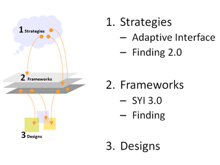 你可以從中看到自己的影響力到哪,一個設(shè)計師如果是精于designs,那你是個很好的設(shè)計助理,如果能能對frameworks提出成熟方案,那應(yīng)該是個很合格的交互設(shè)計師了,如果你對strategies有影響,甚至有一定決策權(quán),那恭喜你,你理所當然應(yīng)該得到所有HCIer的尊重。