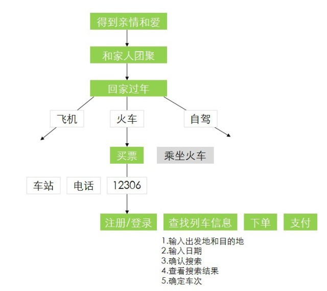 比如“訂票”是過年回家這個目標的任務(wù),但是卻是12306注冊登錄、搜索車票、預定、支付任務(wù)的目標。