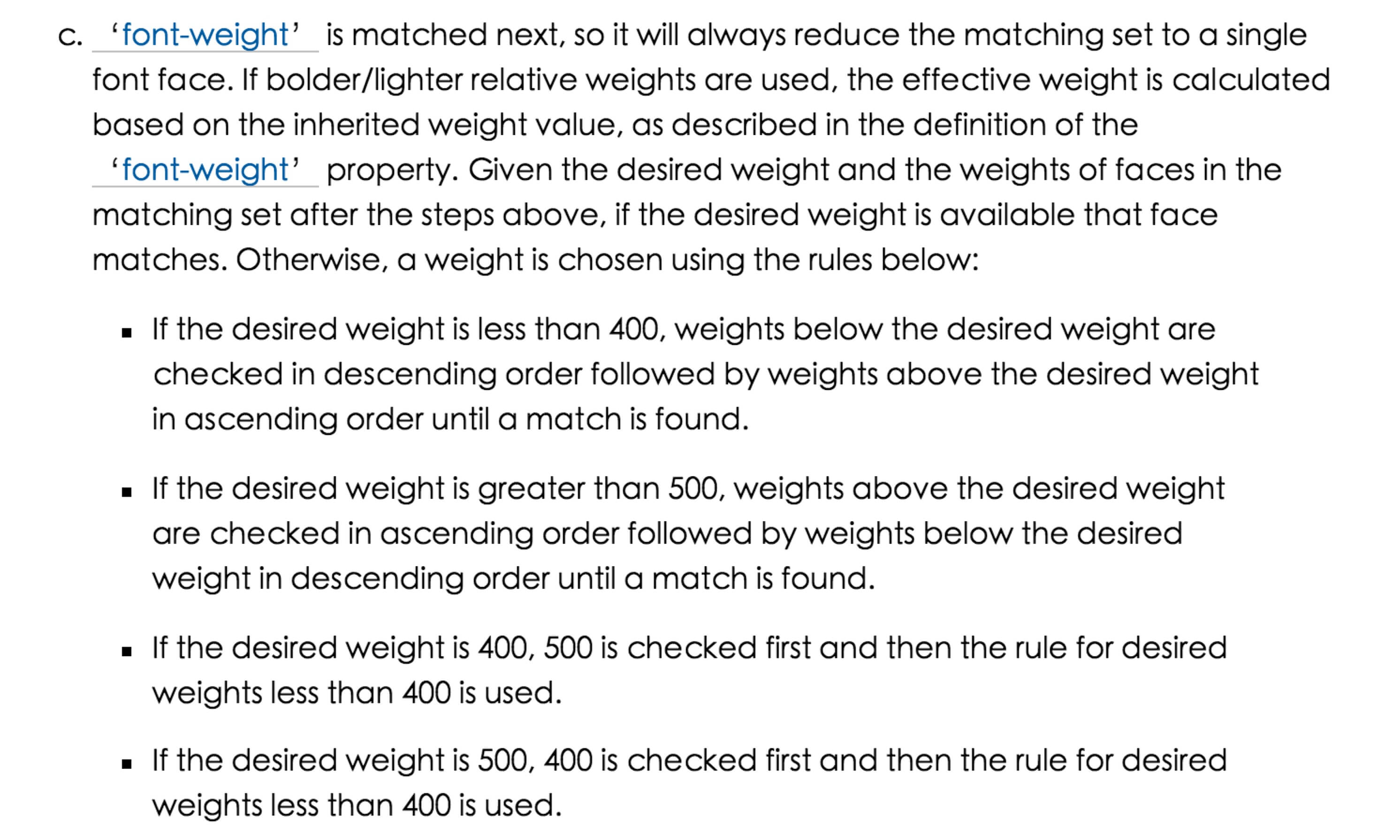 為什么呢?根據(jù)結(jié)果表現(xiàn),我們可以反推出,字重在瀏覽器去渲染時(shí)早已經(jīng)按照算法去一一匹配好。也就是,400匹配的字重在500匹配之前已經(jīng)匹配好了(說起來有點(diǎn)拗口,大家可以根據(jù)Figure.16的例子體會下)。