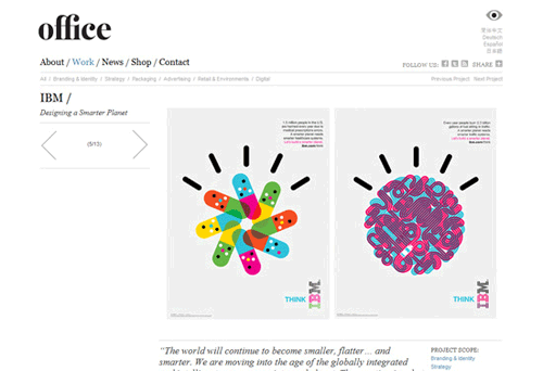 舉例來說,IBM的智能星球運(yùn)動(dòng) (Smarter Planet campaign)涉及到多個(gè)方面的主題,與其相關(guān)的印刷品、插畫、圖表、人機(jī)互動(dòng)素材等都遵從著同一套方案標(biāo)準(zhǔn),包括幾何框架、線條風(fēng)格、色彩飽和度等。無論是在網(wǎng)站,還是在平面媒體中,相關(guān)主題的視覺表現(xiàn)形式都具有高度的一致性。