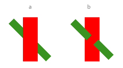 連續(xù)原則 和閉合原則有些類似。以實(shí)物形象上的不連續(xù)使瀏覽者產(chǎn)生心理上的連續(xù)知覺(jué)??吹絘圖,瀏覽者會(huì)認(rèn)為是一個(gè)綠色條和一個(gè)紅色相交,而事實(shí)卻是b圖。