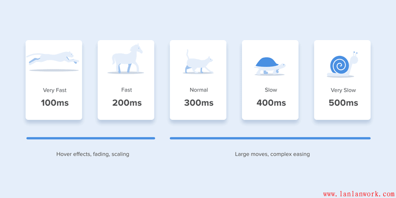 大量的研究發(fā)現(xiàn)在界面中最優(yōu)的時(shí)間是200-500ms。這個(gè)數(shù)字是根據(jù)人類大腦的認(rèn)知水平得出來的。任何小于100ms的動(dòng)畫是人類很難感知到的,而其他大于1秒的動(dòng)畫又會(huì)讓用戶覺得有些延遲,不夠流暢。