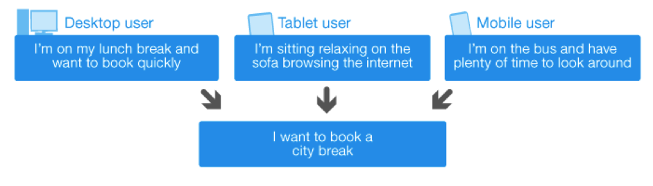 過去,我們通常會假設(shè)用戶在使用移動設(shè)備訪問網(wǎng)站時(shí),其行為都是高度目標(biāo)驅(qū)動化的,例如在旅途中獲取酒店地址、預(yù)訂房間一類。但實(shí)際情況不僅如此——智能手機(jī)、平板電腦等各類移動設(shè)備的用戶,會越來越多的在相對穩(wěn)定從容的狀態(tài)下使用網(wǎng)絡(luò)。所以在很多時(shí)候,用戶使用不同設(shè)備的目標(biāo)差別并沒有想象的那么大,我們不能片面的假設(shè)不同類型設(shè)備的用戶對功能的需求差異。